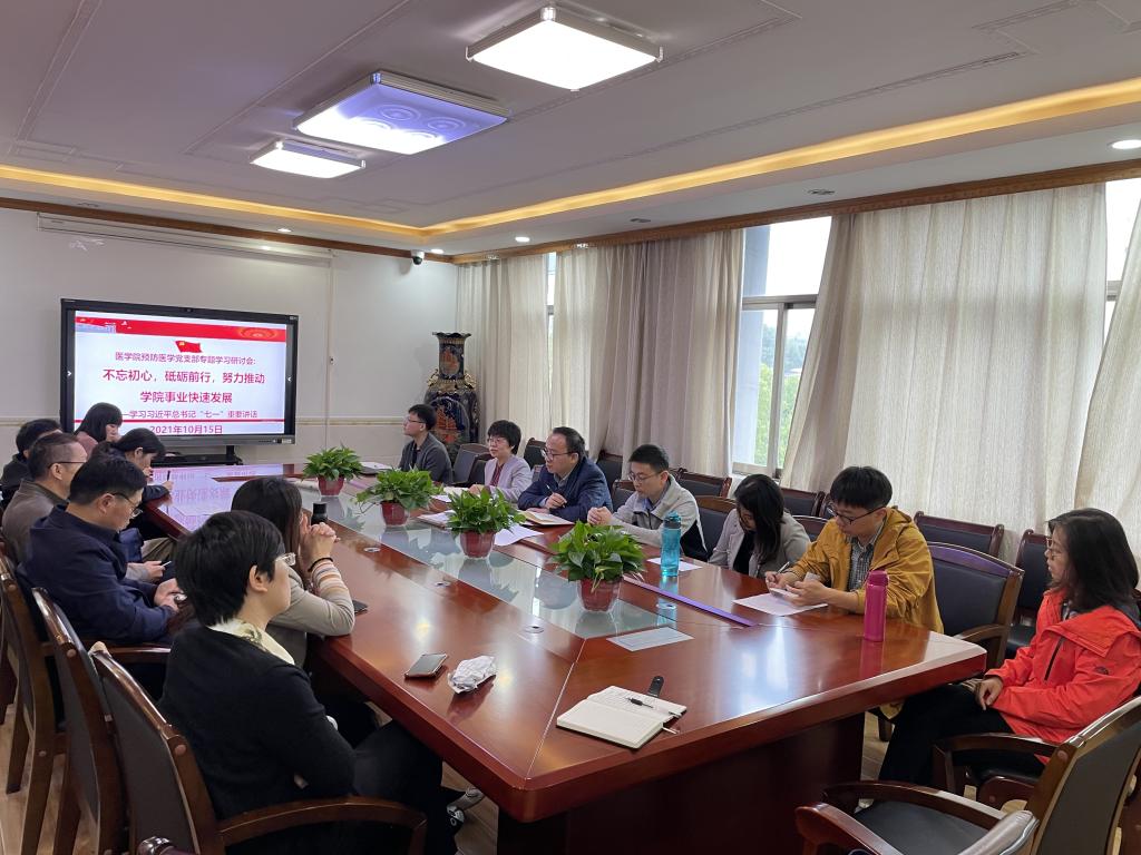 2021年10月15日星期五,预防医学党支部学习会在金沙官网办公楼四楼会议室召开专题学习研讨会。全体支部成员认真学习习近平总书记“七一”重要讲话精神。