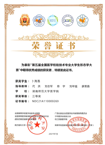 “国药器械长沙杯”湖南省首届医学检验技能大赛暨学术交流会由湖南省医学教育科技学会医学检验教育专业委员会主办,中南大学湘雅医院和中南大学湘雅三医院共同承办。本次比赛在长沙举行,设形态学和核酸检测防护服穿戴两个项目,采用医院检验师和院校学生同时竞赛、同一标准评分,分组设奖,是一次师生的同台竞技。有来自全省各地州市医疗单位的75支队伍参赛。金沙官网李伟凡,罗静,吴若兰代表学院参赛,从75支队伍、225名参赛选手中脱颖而出,荣获二等奖。
