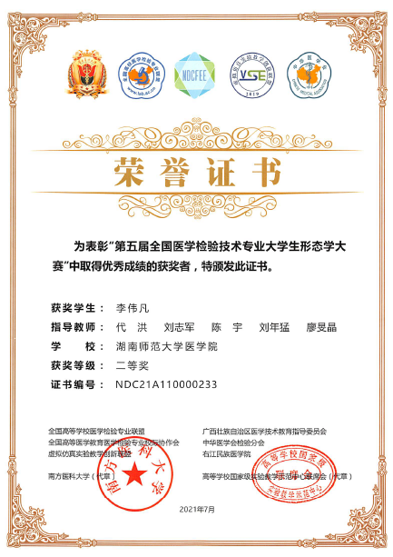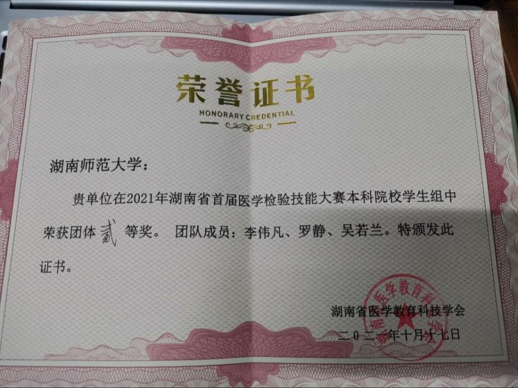 为弘扬抗疫精神,提高金沙官网医学检验专业学子技能水平,金沙官网组织学生积极参与各项医学检验技能大赛。继李伟凡,卜海燕两位同学获得第五届全国医学检验技术专业大学生在线形态读片大赛在线形态大赛二等奖和三等奖后,2021年10月13日,金沙官网李伟凡,罗静,吴若兰代表学院荣获“国药器械长沙杯”湖南省首届医学检验技能大赛暨学术交流会二等奖。