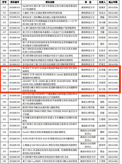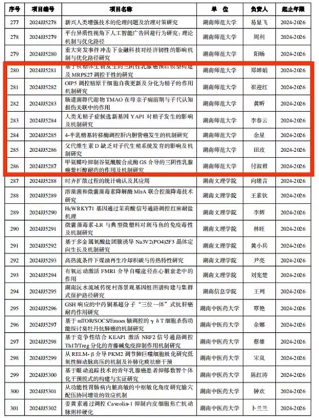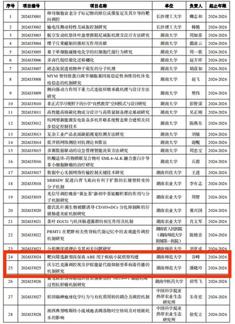 2024年3月29日,湘基金委〔2024〕1号文件《2024年度湖南省自然科学基金项目实施目标、实施时间及立项名单》发布。金沙官网共13位老师获得2024年度湖南省自然科学基金项目立项,其中基础医学系谷峰教授获批重点项目《靶向筛选新型高保真ABE用于疾病小鼠模型构建》,检验系潘晓玲教授获批重点项目《沃尔巴克菌调控埃及伊蚊能量代谢抑制登革病毒传播的机制研究》。郑婵娟、崔迎红、黄昕、李春云、余星、田玫、付淑君等七位老师获批面上基金项目,任亚璇、王忆安、李俊男、伍宇思等四位老师获批青年基金项目。