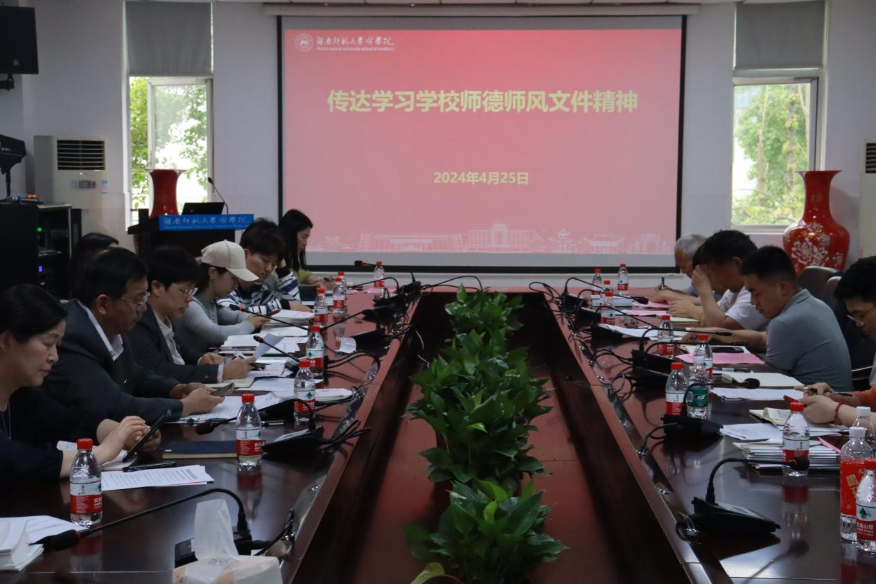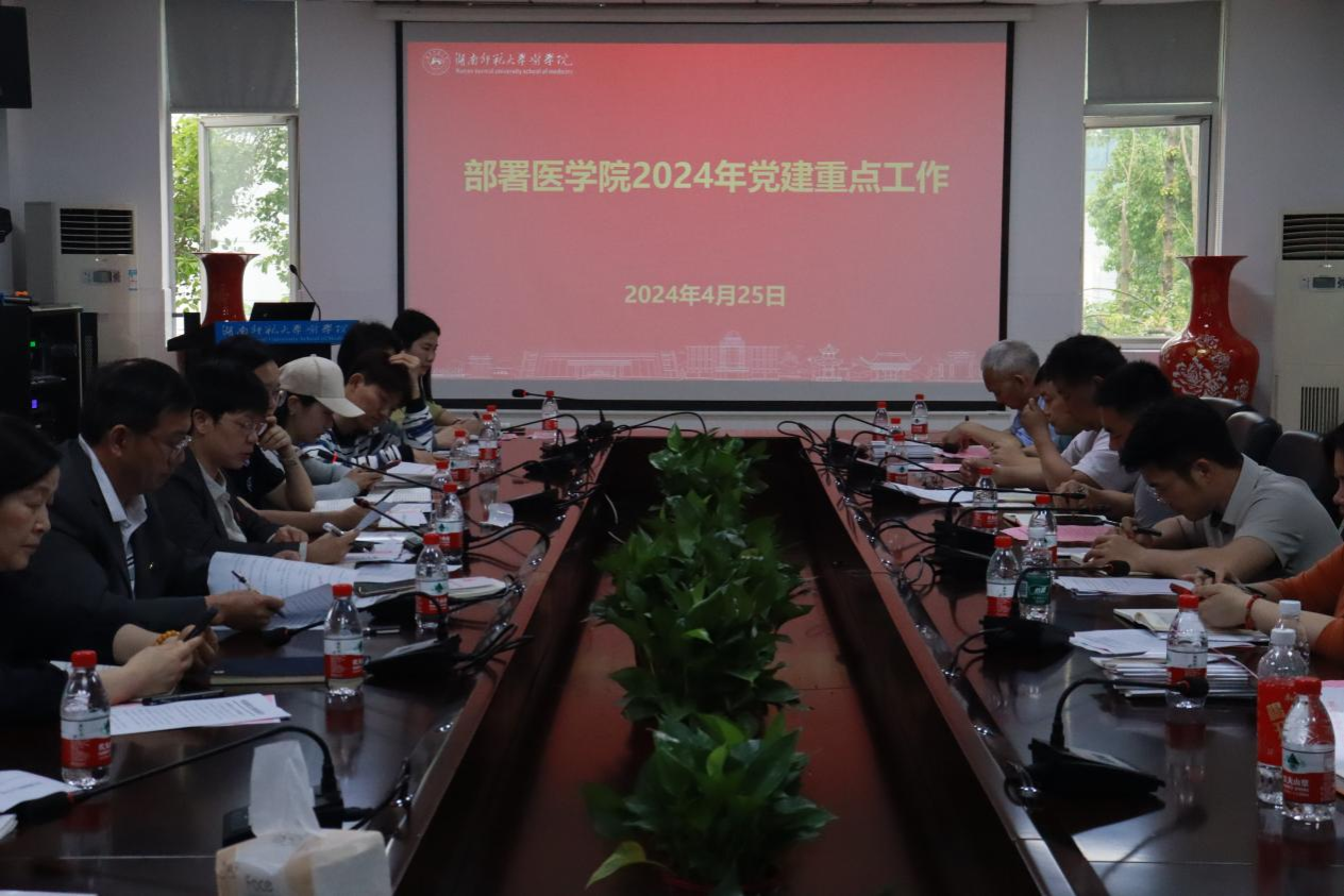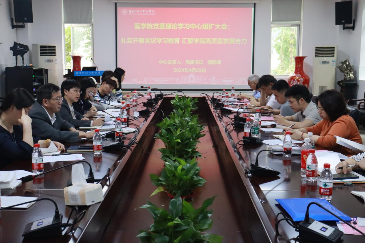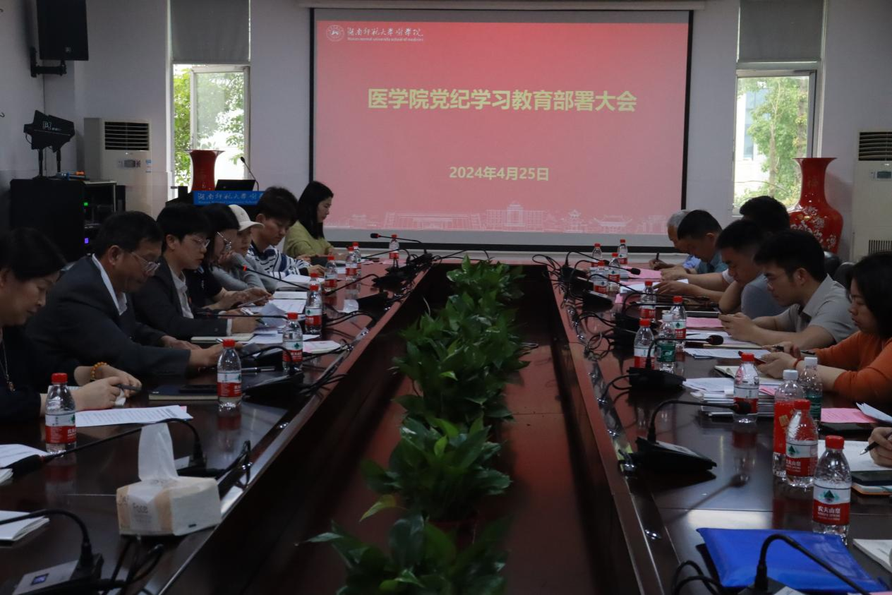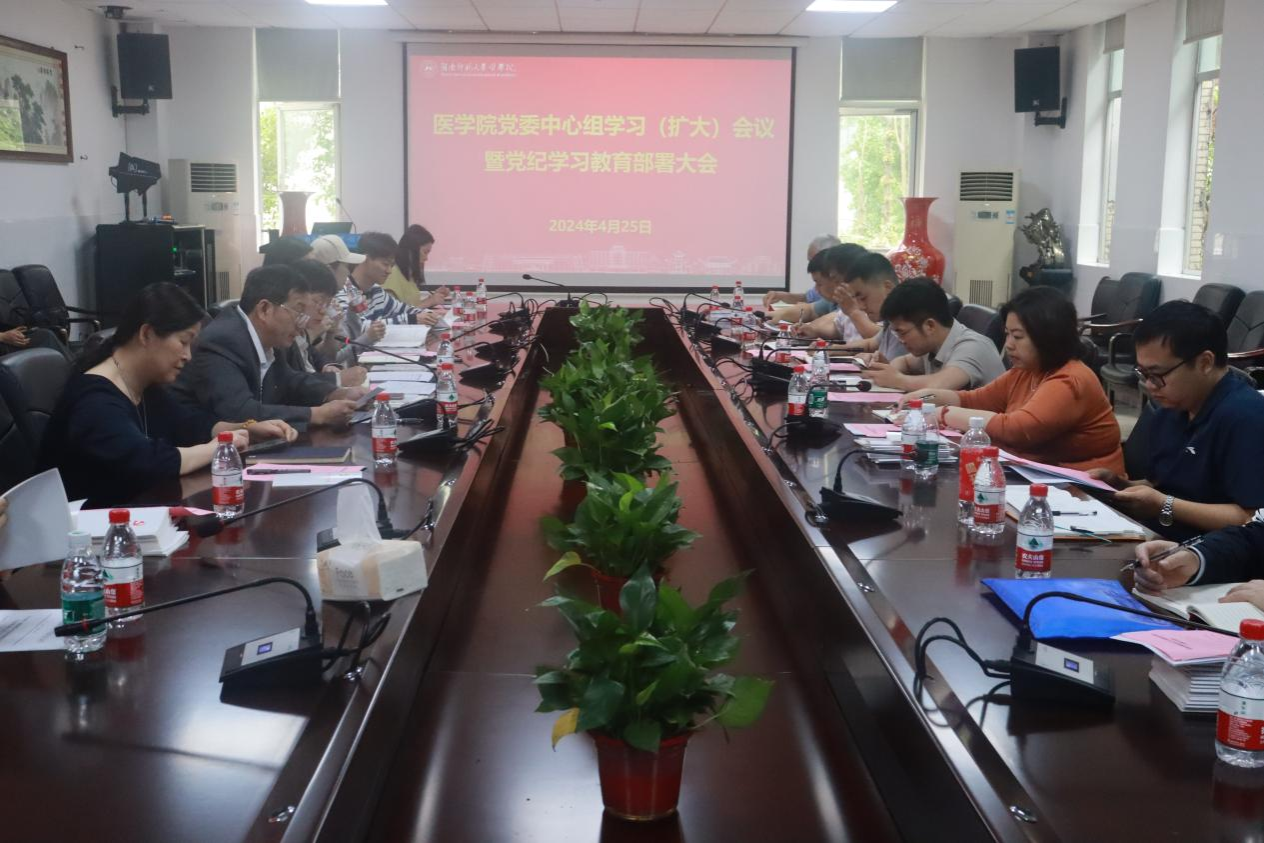 4月25日下午,金沙官网在仁医楼207会议室召开金沙官网党委中心组学习(扩大)会议暨党纪学习教育部署大会,会议传达学习中央和省委及学校关于开展党纪学习教育的有关文件精神,专题研究部署党纪学习教育有关工作。全体班子成员、系主任、支部书记和全体支委(含学生支部)参加会议。会议由院长何祖平主持。