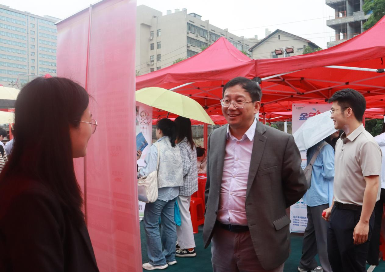 4月25日,金沙官网举办2024届毕业生医药学专场春季双选会。金沙官网院长何祖平、院党委书记鄢朝晖、党委副书记陈松携学工办全体辅导员一行深入招聘会现场,与用人单位代表交流用人单位的人才需求,听取他们对医药类专业学生教育培养方面的意见建议。此外他们还与前来应聘的毕业生亲切交谈,了解其就业规划和应聘情况,给予其经验上的指导和建议,并鼓励他们积极投递简历,抓住工作机会。