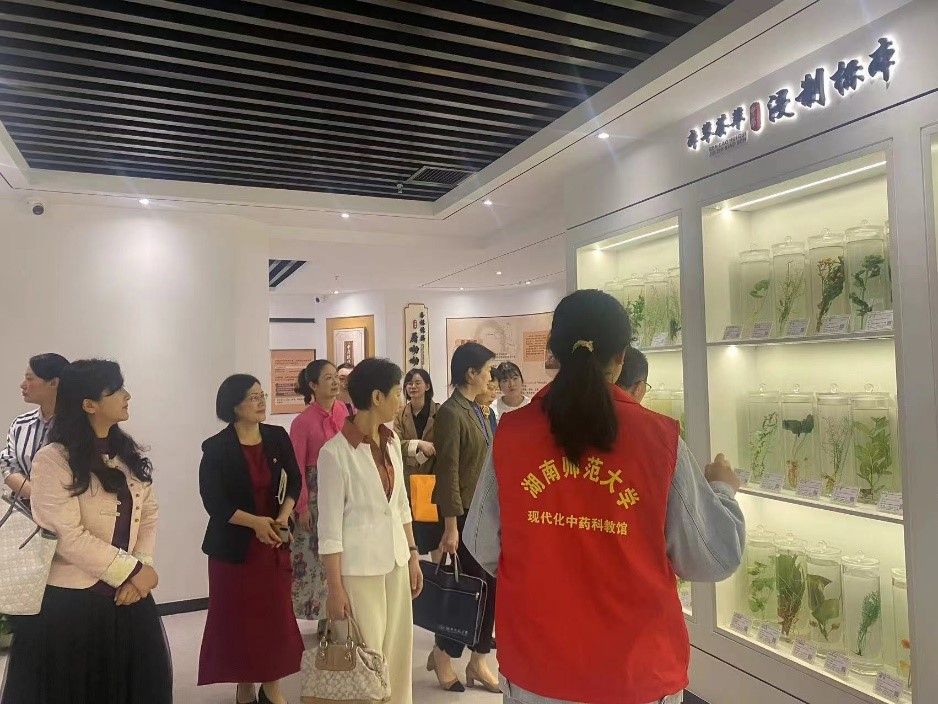 专家们重点观察了本草荟萃即中药标本展示区域,包括浸制药材展区和蜡叶标本展区,专家们对丰富多样的标本表现出极大兴趣。随后,一行人移步至中药智慧教学平台和道地药材智能沙盘,这里可实现自然环境的3D重现,戴上头盔,便可身临其境的进行野外行走、野外观察和野外采摘。智能沙盘通过查询演示全国各省中草药资源分布,体现出湖南省优异的地理位置和自然条件。