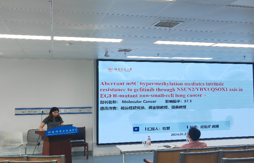 首先,博士研究生杜黎对2023年发表在Molecular Cancer的一篇研究性论文“Aberrant m5C hypermethylation mediates intrinsic resistance to gefitinib through NSUN2/YBX1/QSOX1 axis in EGFR-mutant non-small-cell lung cancer”进行汇报。该研究聚焦了当下热点甲基化及m5C调控,揭示了NSUN2-YBX1-QSOX1轴是一种以前未被发现的调节NSCLC对EGFR-TKIs内在抗性的机制。抑制NSUN2-YBX1-QSOX1轴在m5C依赖性吉非替尼耐药中发挥了固有的调节作用。强调了NSUN2-YBX1-QSOX1轴作为对EGFR-TKIs具有内在抗性的NSCLC患者预后和治疗的候选生物标志物。