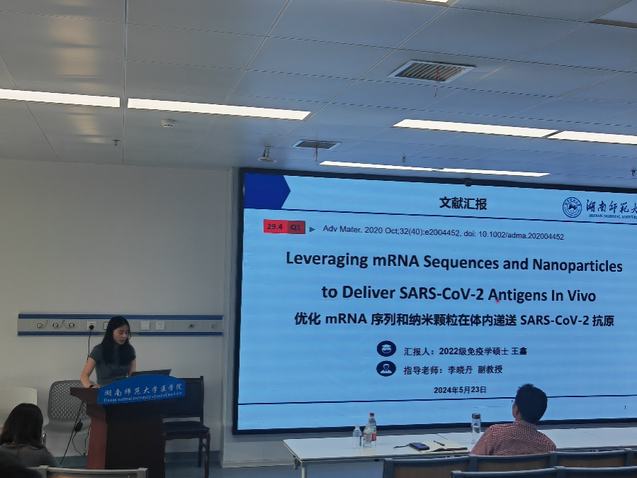 接着,硕士研究生王鑫对2020年发表在Advanced Materials上的题为“Leveraging mRNA Sequences and Nanoparticles to Deliver SARS-CoV-2 Antigens In Vivo”的研究性论文展开汇报。文章中研究人员首先对内源基因表达进行了综合分析,并通过对mRNA的5′和3′UTR进行筛选、组合和优化,确定了一种名为NASAR的最佳UTR组合。通过优化mRNA的UTRs并结合纳米颗粒递送系统,成功开发出一种高效的mRNA疫苗。该疫苗能够在体内触发显著的SARS-CoV-2抗原表达,并产生强烈的免疫反应。这一成果为mRNA疫苗的研发提供了新的思路和方法,对于未来抗击冠状病毒及其它传染病具有重要意义。