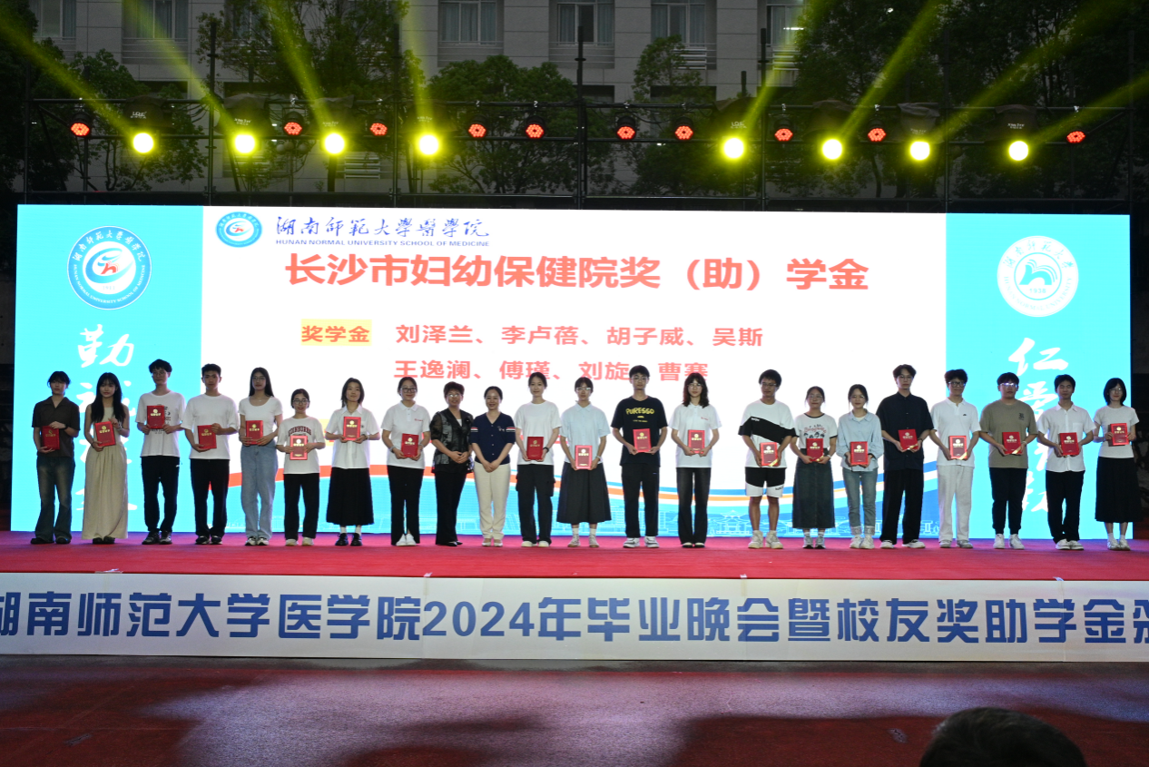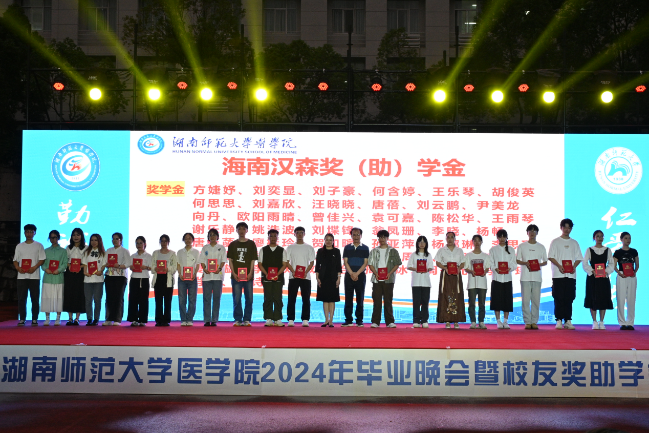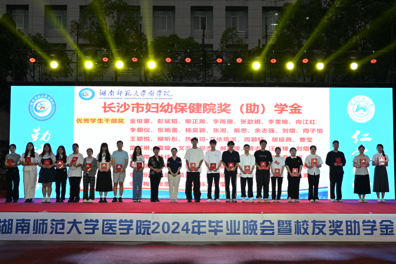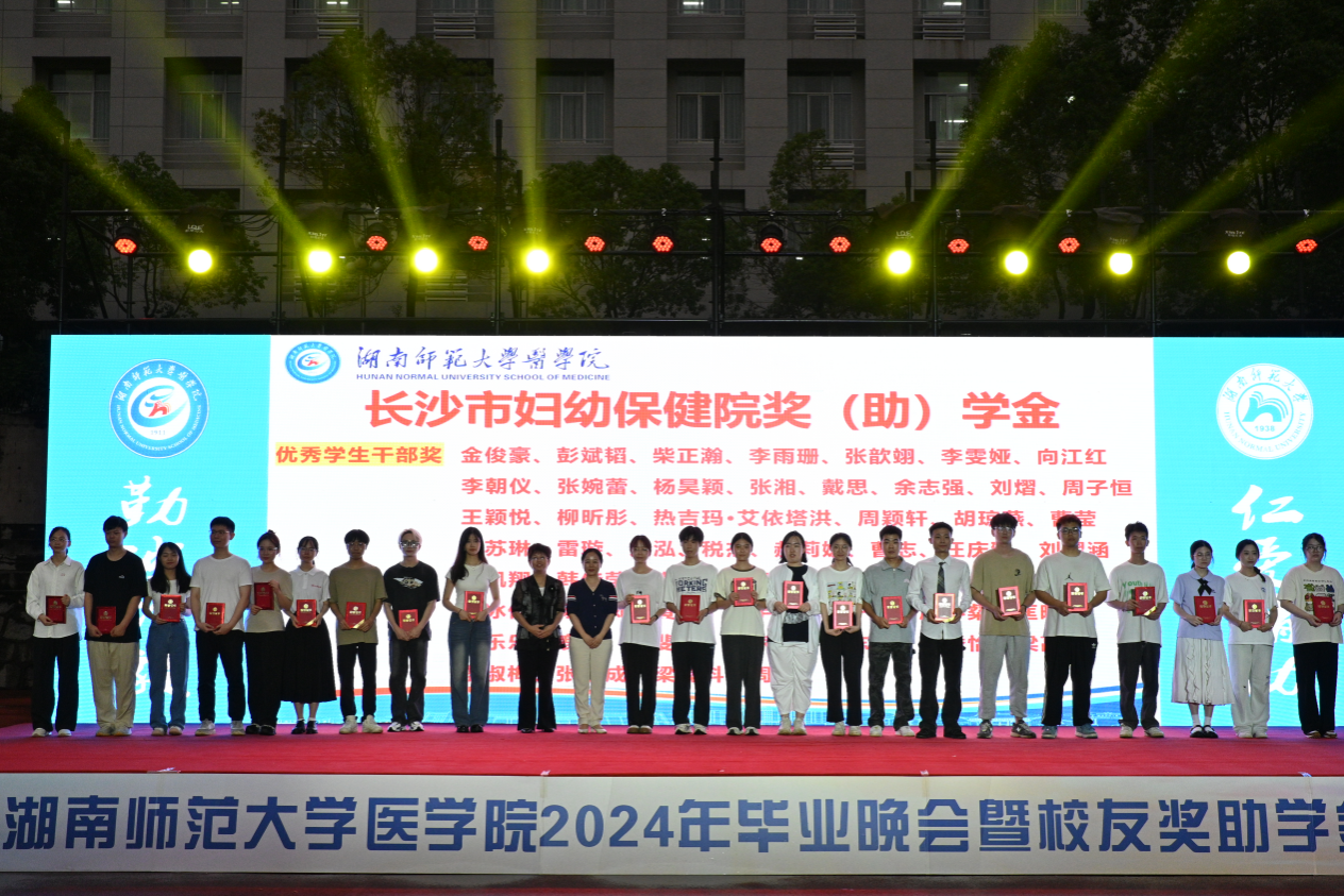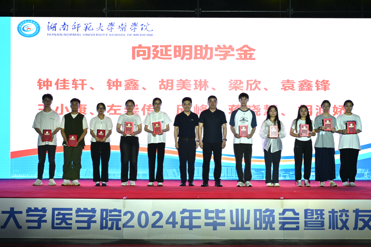 本次颁奖典礼共颁发了何祖平—蒋吉吉医学之星奖学金、长沙市妇幼保健院奖(助)学金、海南汉森奖(助)学金、刘红蕾奖学金、刘习明奖学金、凯普创新创业奖学金、戴敬康奖(助)学金、杨勇军-田静奖(助)学金、南京江河华晟奖(助)学金、向延明助学金、东莞友华医院奖(助)学金、研究生康源奖学金、金圣达助学金、邓志辉助学纾困专项资助助学金等十四项,共294名同学与团队获奖,部分校友上台颁奖。