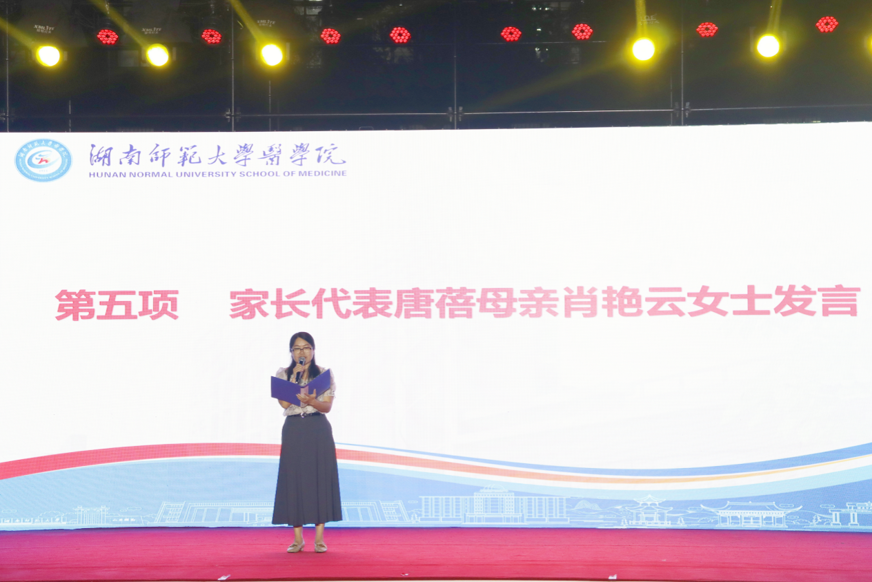 唐蓓母亲作为家长代表发言。她向即将踏上人生新征程的毕业生们致以热烈祝贺和美好祝福,向为毕业生成长付出辛勤汗水的老师表达敬意和感谢,同时向各位校友的支持与鼓励表示衷心的感谢。