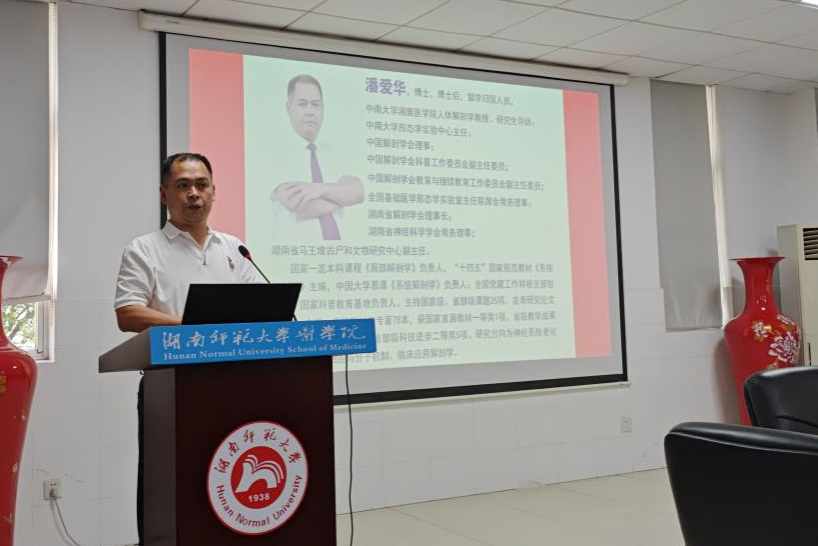 潘爱华致辞,他充分肯定了医学绘图大赛的意义,并指出可以通过扩大比赛规模来增强医学形态学绘图竞赛影响力,从而增加参与人数。他希望同学们积极参加国家级、省级竞赛,通过比赛促进大学生德智体美劳全面发展,提升医学美育的水平,以赛助学、以赛助教。