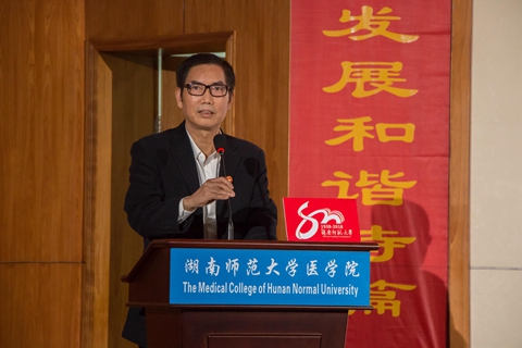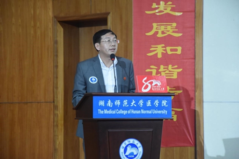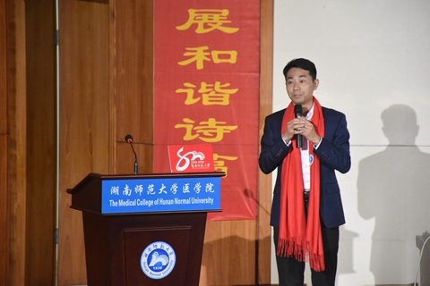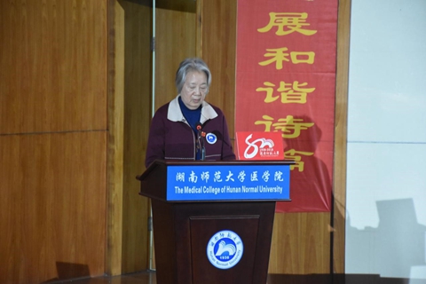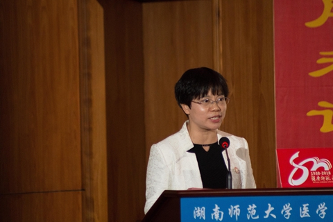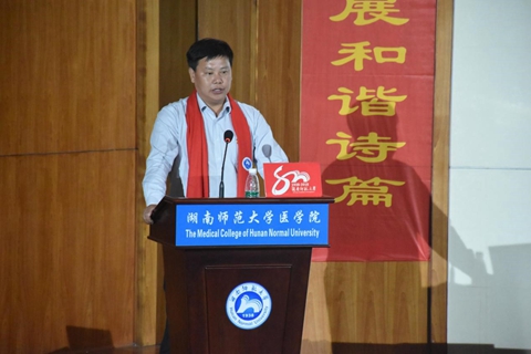 教师代表黄琼瑶教授在发言中为学院的飞速发展而高兴,为奋斗在三湘大地五湖四海医药卫生事业的校友们感到欣慰,她祝愿校友们在岗位上事业有成,希望学院抓住发展机遇,发挥优势,同心同德,为医学教育再创辉煌。