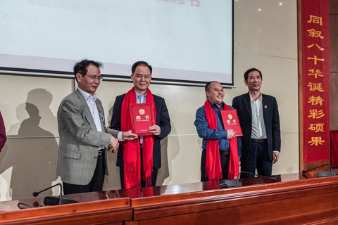 js555888金沙老品牌副校长匡乐满,原js555888金沙老品牌常务副校长卢岳华,原js555888金沙老品牌副校长瞿树林,为校友刘令安、刘习明、谈发金颁发兼职教授聘书。