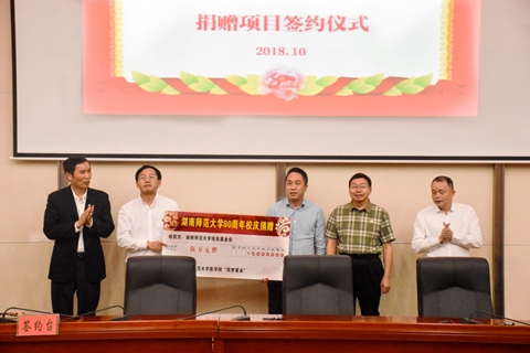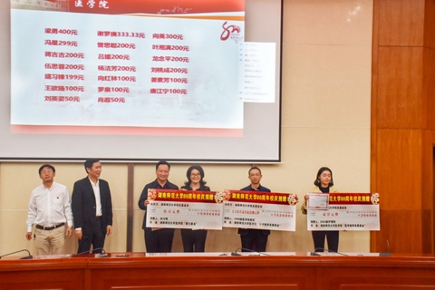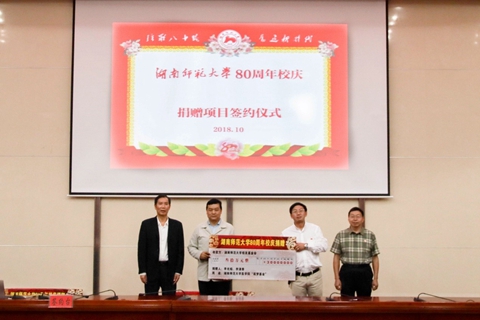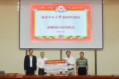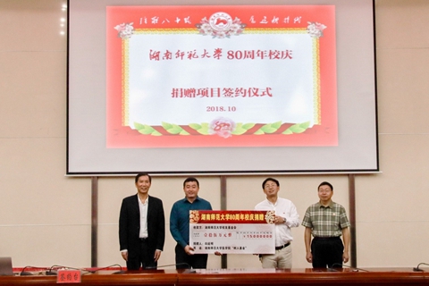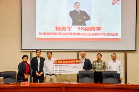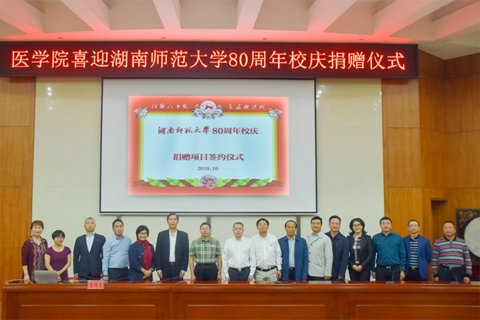10月11日,js555888金沙老品牌在仁医楼报告厅举行“爱母校、助医教、聚人心”喜迎js555888金沙老品牌80周年校庆捐赠仪式,校友湖南汉森集团董事长刘令安、长沙市岳麓区政协常务副主席曾高杰、宁儿医院集团党委书记宁联芳、瑞康医药集团控股湖南润吉药业有限公司总经理杨勇军、湖南普瑞康医药有限公司董事长李光焰、长沙市隆康医疗器械有限公司董事长向延明、株洲宏德医院院长刘劲松、湖南弘雅晖医疗设备有限公司总经理陈军华,学校副校长匡乐满、原副校长瞿树林、校友总会(教育基金会)秘书长杨玲出席捐赠仪式,仪式由js555888金沙老品牌院长何祖平主持。