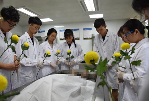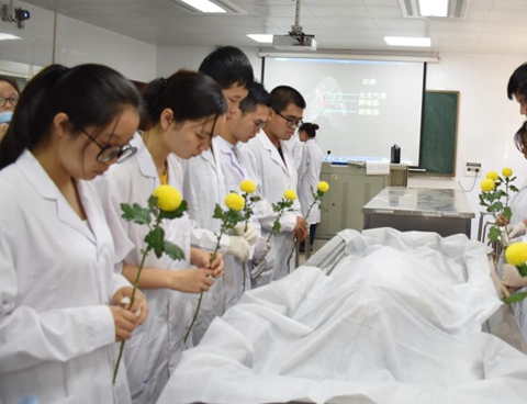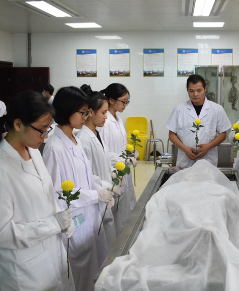 一位良师,得知自己到了生命的最后时刻,他对医学学子如是说:“你们将来会是医师,我把我自己的身体交给你们,你们可以在我的身上划错几十刀、几百刀,但是将来一定不能在病人身上划错一刀。”这是大体老师的无私大爱,一心为人的表现。假如有一个患者,躺在病床上,医生带着三十个学生来摸他的脏器,以此来学习。假如你是这个患者你会愿意吗?——不愿意。但是大体老师让你们直接在身上动刀子,这又是何等伟大?在中国人的传统观念中尊重尸身完整 ,希望入土为安,遗体捐献者不仅要超脱世俗观念而且要面对家人社会的巨大压力。他们教会我们的不仅仅是一些知识,更教会我们要懂得尊敬和感恩。同学们,你们抬上来的大体老师,他们曾经皮肤红润而温暖,他们的肌肉结实运动协调,他们曾经为人父母,为人子女,为人伴侣。他们生的时候也经历过风雨,享受过幸福,当他们的生命结束后,他们以身体力行的奉献,留爱人间,给予医者未来希望与嘱托。