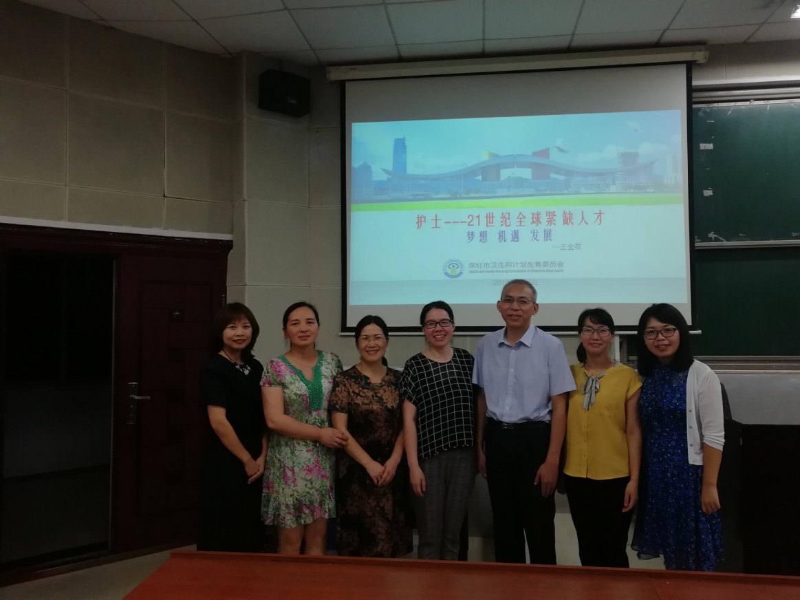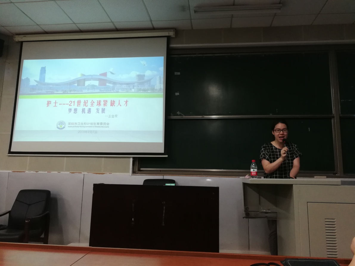 9月8日晚,金沙官网在仁医楼306教室举行“护士—21世纪全球紧缺人才 ”讲座。讲座由深圳市卫生计生委医政处副主任科员王金花主讲,金沙官网护理系主任王卫红主持,检验系袁仕善教授、护理系约150名师生参加讲座。