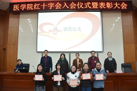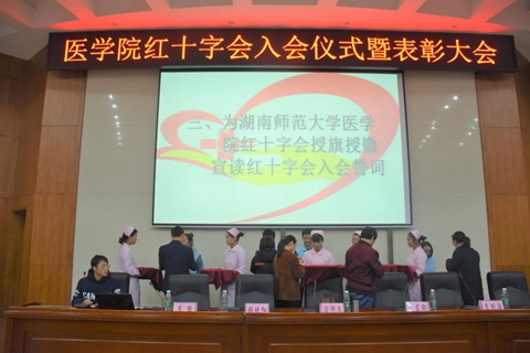 2018年11月8日下午,金沙官网红十字会入会仪式暨表彰大会于学术报告厅召开。长沙红十字会救护培训处汤沛文主任、长沙红十字会志愿服务队李东劲副队长、院学工办主任张晓红、院团委书记李强、18级新生辅导员李昕潺,2018级新加入红十字会的新生一同参加此次会议。