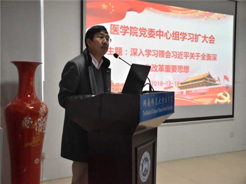 12月18日,金沙官网党委中心组在仁医楼207会议室召开中心组学习扩大会,深入学习习近平总书记关于全面深化改革重要思想,并围绕习近平总书记在庆祝改革开放40周年大会精神进行了讨论。学院全体党委中心组成员、全体支部书记和各系(中心)、办主任参加了会议,会议由院党委书记鄢朝晖主持。