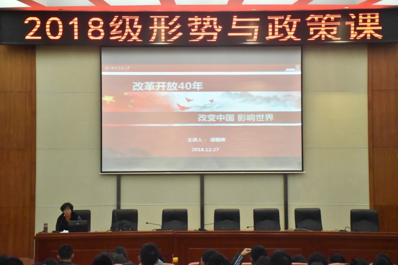 12月27日晚七点,学院2018年“形势与政策”课专题二——“改革开放40年”于学术报告厅开讲。金沙官网党委书记鄢朝晖担任主讲人。2018级全体本科生听取了讲座。