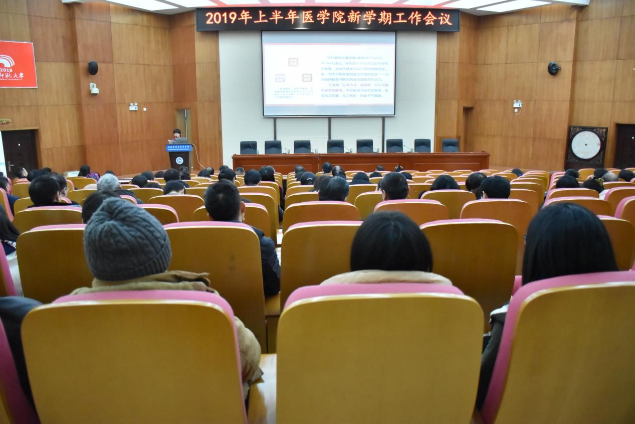 2019年2月24日下午,金沙官网新学期工作大会在仁医楼学术报告厅举行。院长何祖平作新学期工作报告,会议由党委书记鄢朝晖主持。