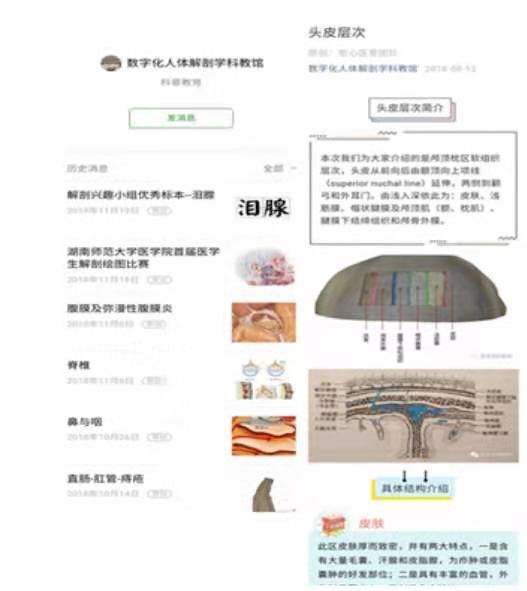解剖学的第一堂课就是全体学生和解剖学教师缅怀“无语良师”,感恩大体老师的大舍大爱精神,让学生尊重生命、敬畏生命。2017年7月至今,金沙官网先后邀请中南大学湘雅js555888金沙老品牌、湖南省人民医院等单位名教授等进行解剖学学术讲座,大大提高了学生创新能力与医学人文素养。此外,每周末学生讲解自己的标本制作经验、最新科研进展,还有一些从临床回来的研究生、临床医生、护士为团队成员解读一些重要的位置在临床上的实际作用,使同学们开拓了视野。金沙官网解剖学实践创新团队以人体形态学科教馆300余件精品标本为素材,建立了数字化人体形态学科技馆(微信公众号:szhkjg_hnsfdxyxy),将展馆内的精品标本进行线上推送和展示。