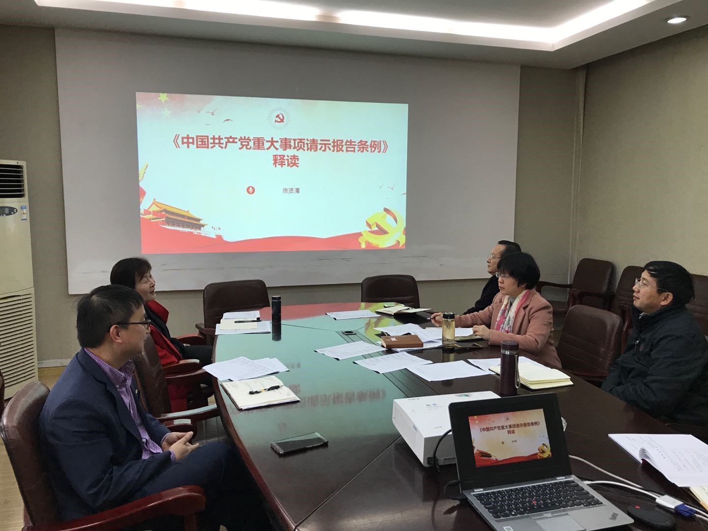 会上,党委中心组成员集体学习了《中国共产党重大事项请示报告条例》和两会精神。鄢朝晖做中心发言,她从《条例》出台的重大意义、制定原则和特点、主要内容和贯彻落实《条例》的要求等方面,对《条例》进行了解读,并就学院进一步学习贯彻落实《条例》提出了具体要求。她指出,作为党的领导干部一定要提高政治站位,强化思想自觉和行动自觉,深刻领会加强请示报告工作的重要意义,准确把握《条例》内涵,把准权责边界,将重大事项请示报告与党建工作和中心工作结合起来,以制度执行推动决策部署,以改革创新发展推动学院工作。