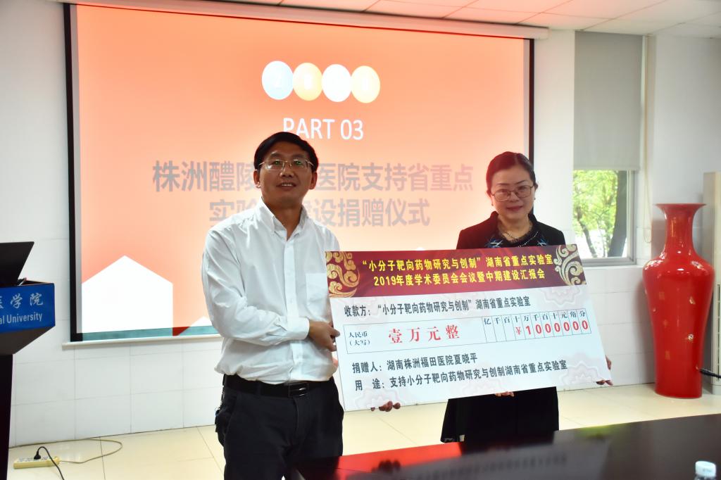 会议开始阶段重点实验实验室主任杨小平教授介绍了莅临本次会议的专家与领导,js555888金沙老品牌党委书记鄢朝晖代表学院致辞。院长何祖平代表学院接受了株洲醴陵福田医院捐赠。