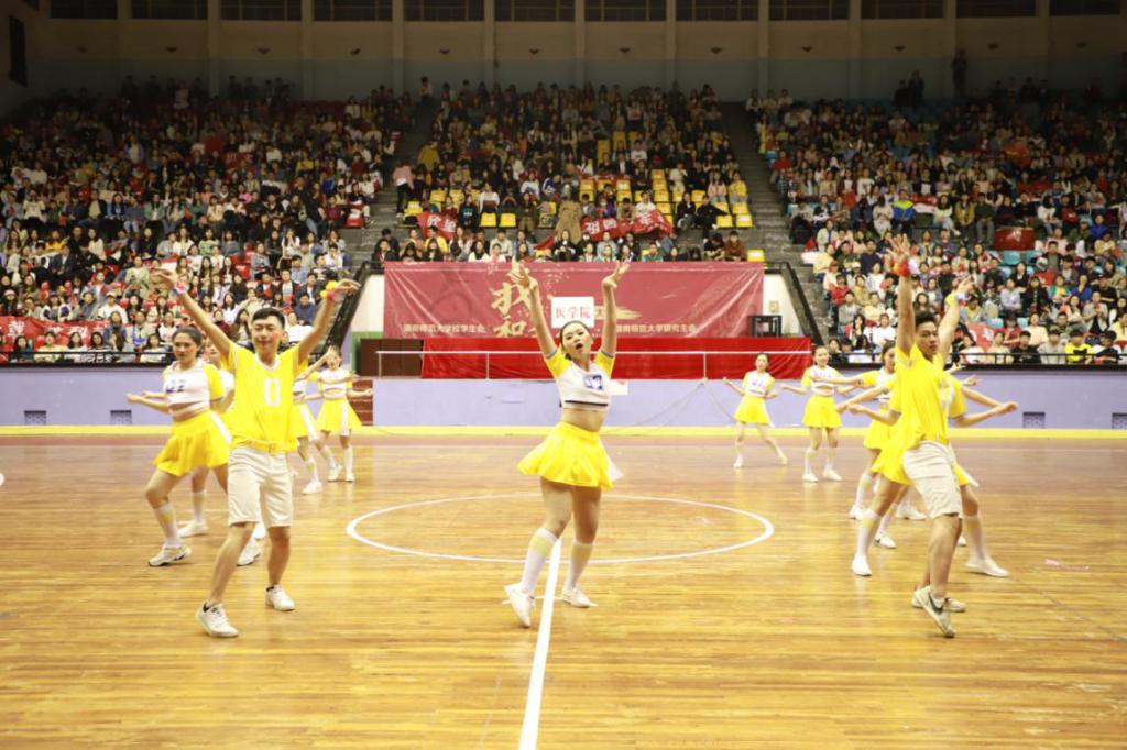 金沙官网选手的一曲《舞动青春》,充分展现出医学生积极向上的精神。在“医生医生,魅力一生,医学医学,堪称一绝”的应援声中,金沙官网参赛队伍随着响亮整齐的口号进入赛场,身着黄色运动裙的健美操选手们形象刻画了医学生的激情与活力。两位男生的参与使得气氛更加热烈,充满动感的舞蹈、强有力的爵士与健美操的结合使医学生在严谨治学之外增添了不少青春气息。金沙官网参赛选手矫健婀娜的身姿和动感十足的音乐碰撞,迸发出不一样的火花,成为体育馆一道靓丽的风景线,最后荣获三等奖佳绩。