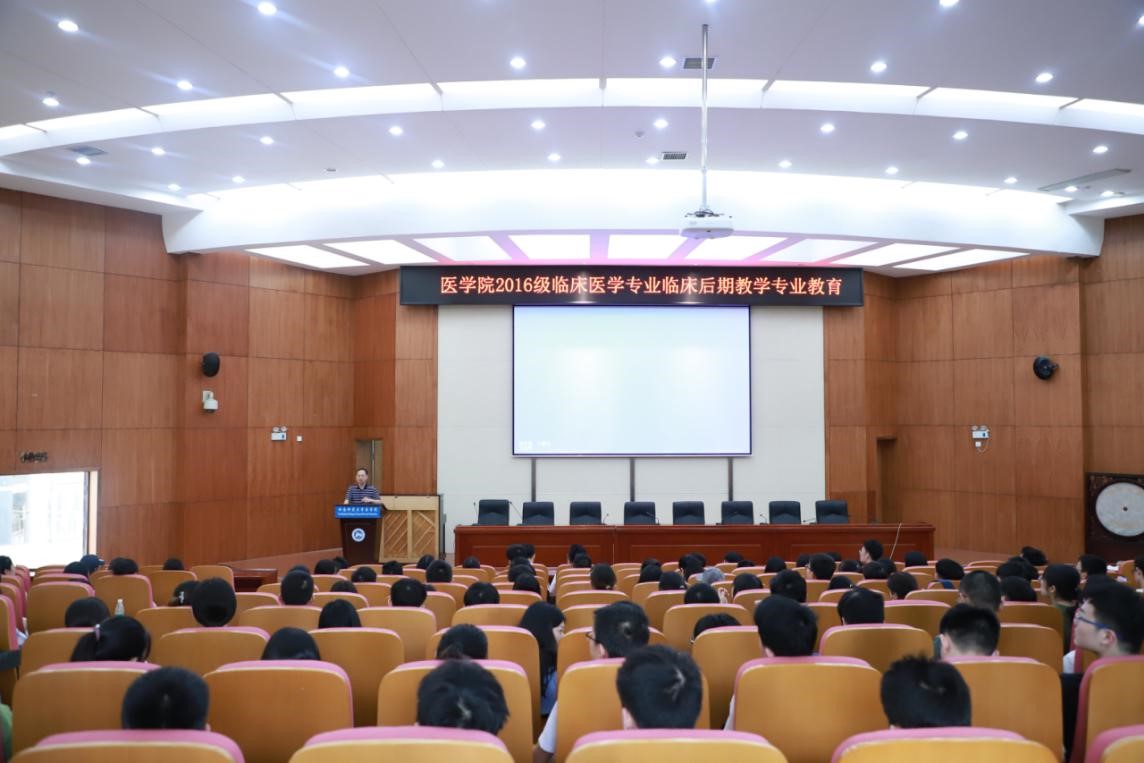6月14日下午,金沙官网于学术报告厅召开16级临床医学专业临床后期教学专业教育大会,会议由临床医学系主任于才红担任主讲人,16级全体临床医学专业学生参与此次会议。