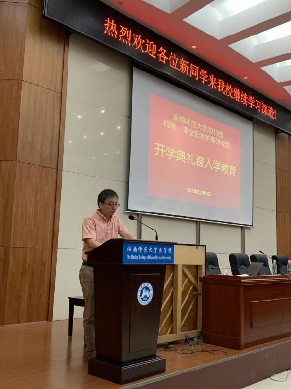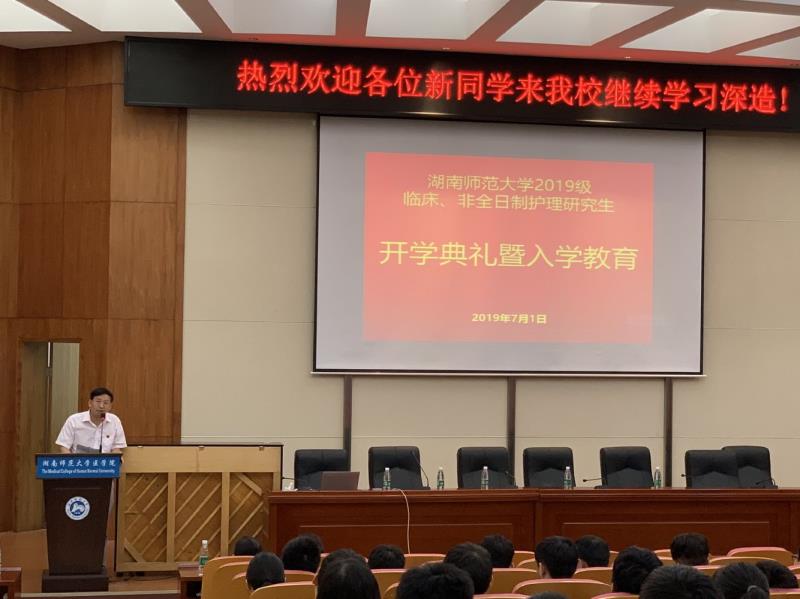 2019年7月1日上午,金沙官网2019级临床和非全日制护理研究生开学典礼在学术报告厅隆重举行。院长何祖平教授、副院长贺权源教授、科研办主任阳美芳老师、临床js555888金沙老品牌负责人朱小文老师和谭茜之老师,及来自全国各地的190多名2019级新生参加了典礼。新生开学典礼由我副院长贺权源教授主持。