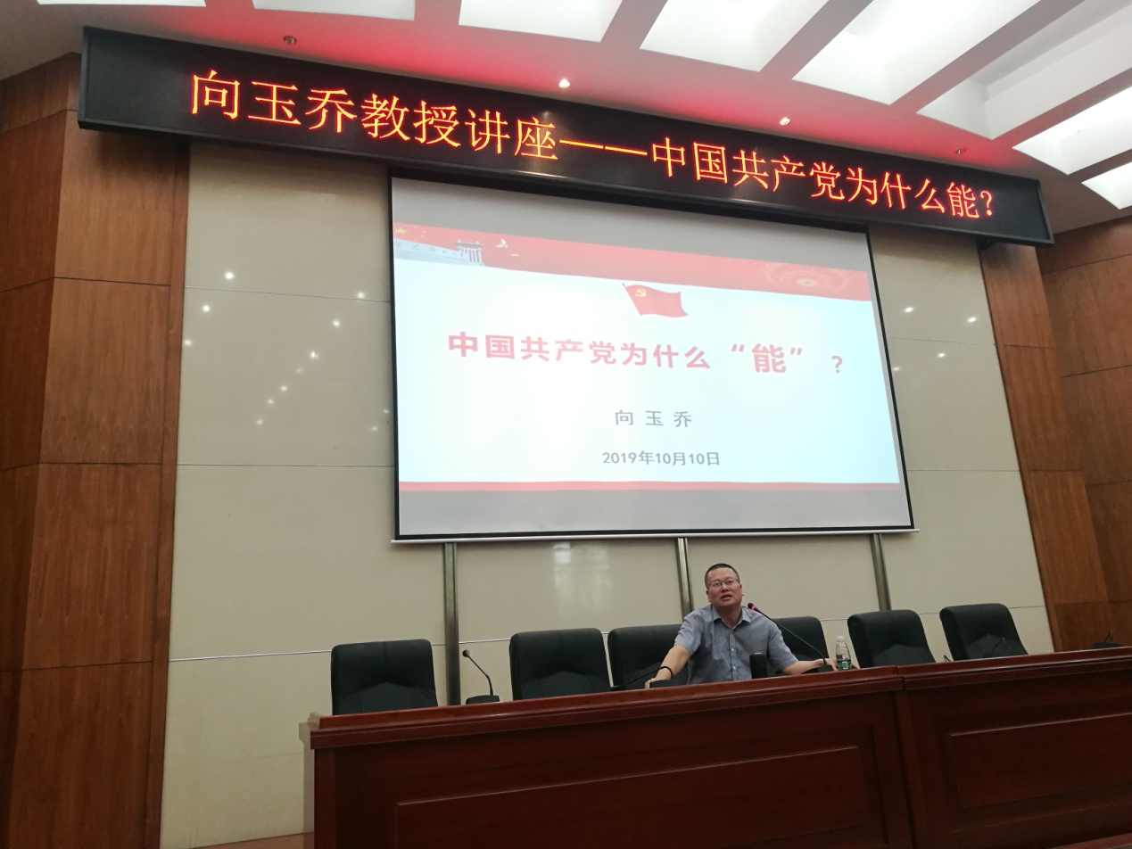 10月10日下午,为深入开展”不忘初心,牢记使命”主题教育,金沙官网组织全体教职工和学生党员在仁医楼学术报告厅举行政治理论学习,js555888金沙老品牌道德文化研究院副院长向玉乔教授为大家宣讲“中国共产党为什么能?”,党委书记鄢朝晖主持报告会。