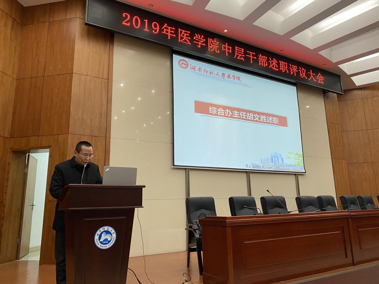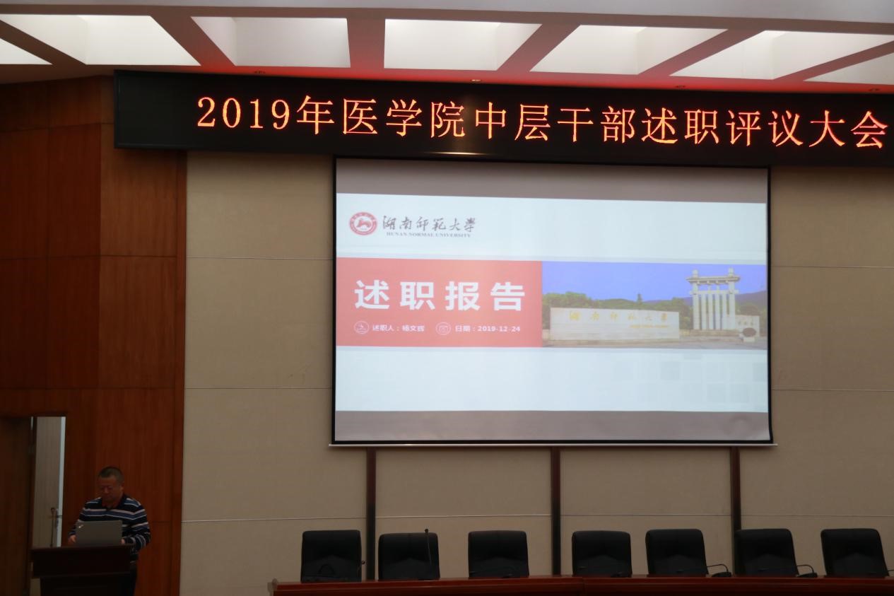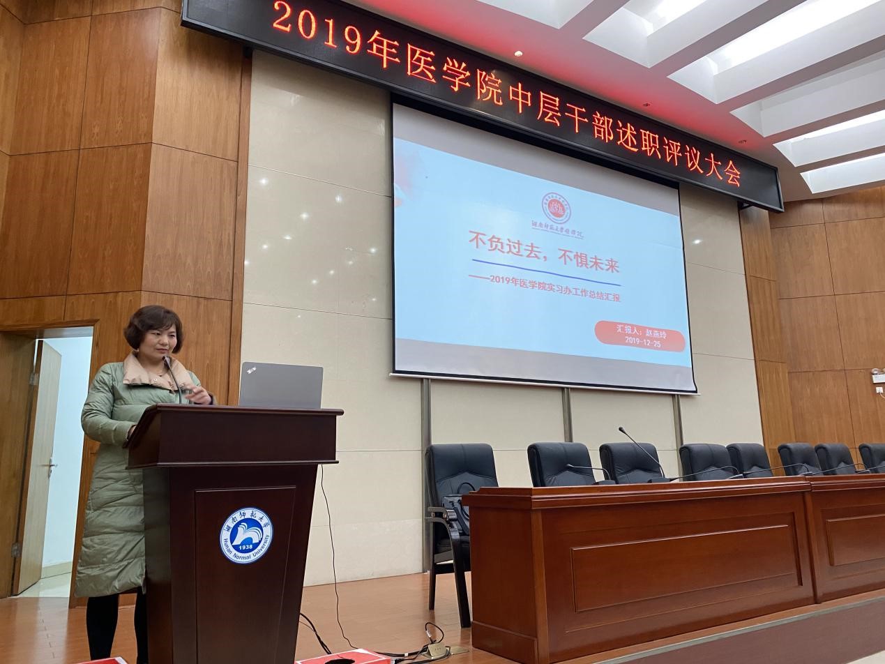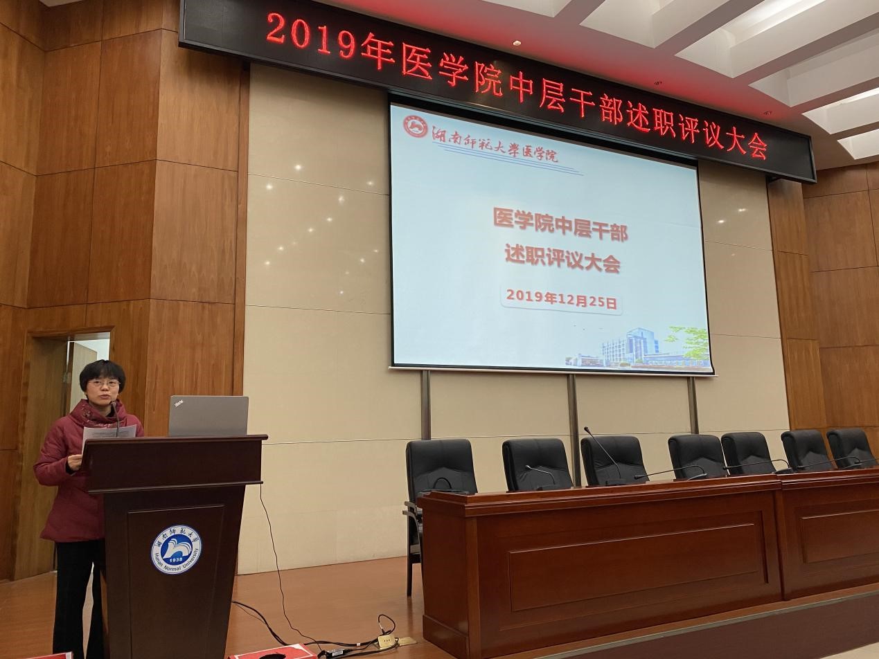 2019年12月25日,js555888金沙老品牌召开了全院中层干部2019年度述职评议大会。院党委书记鄢朝晖主持会议,院长何祖平、副院长张坚松、邓文艳、贺权源、党委副书记陈松出席大会,学院170余名教职员工参加述职评议大会。