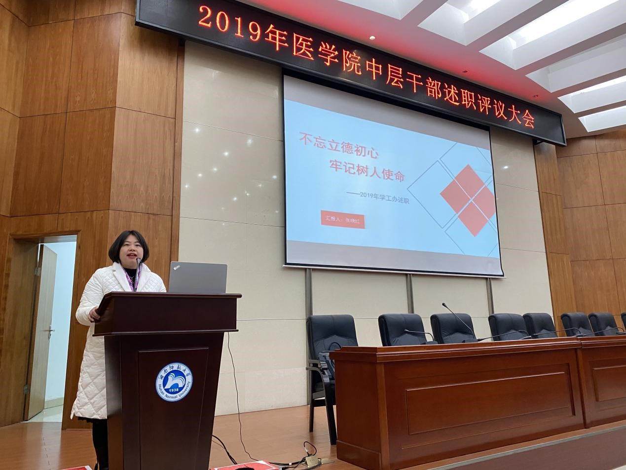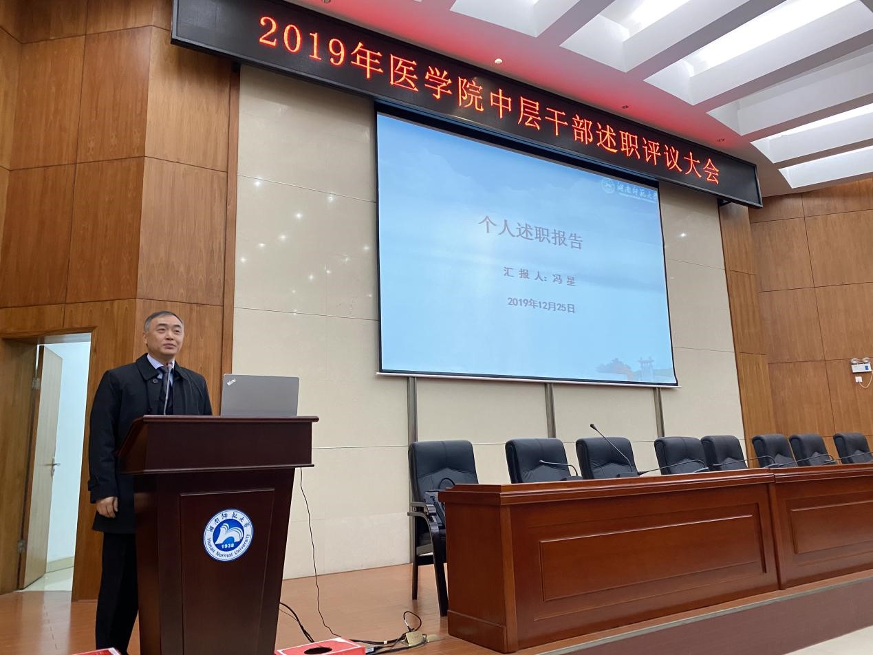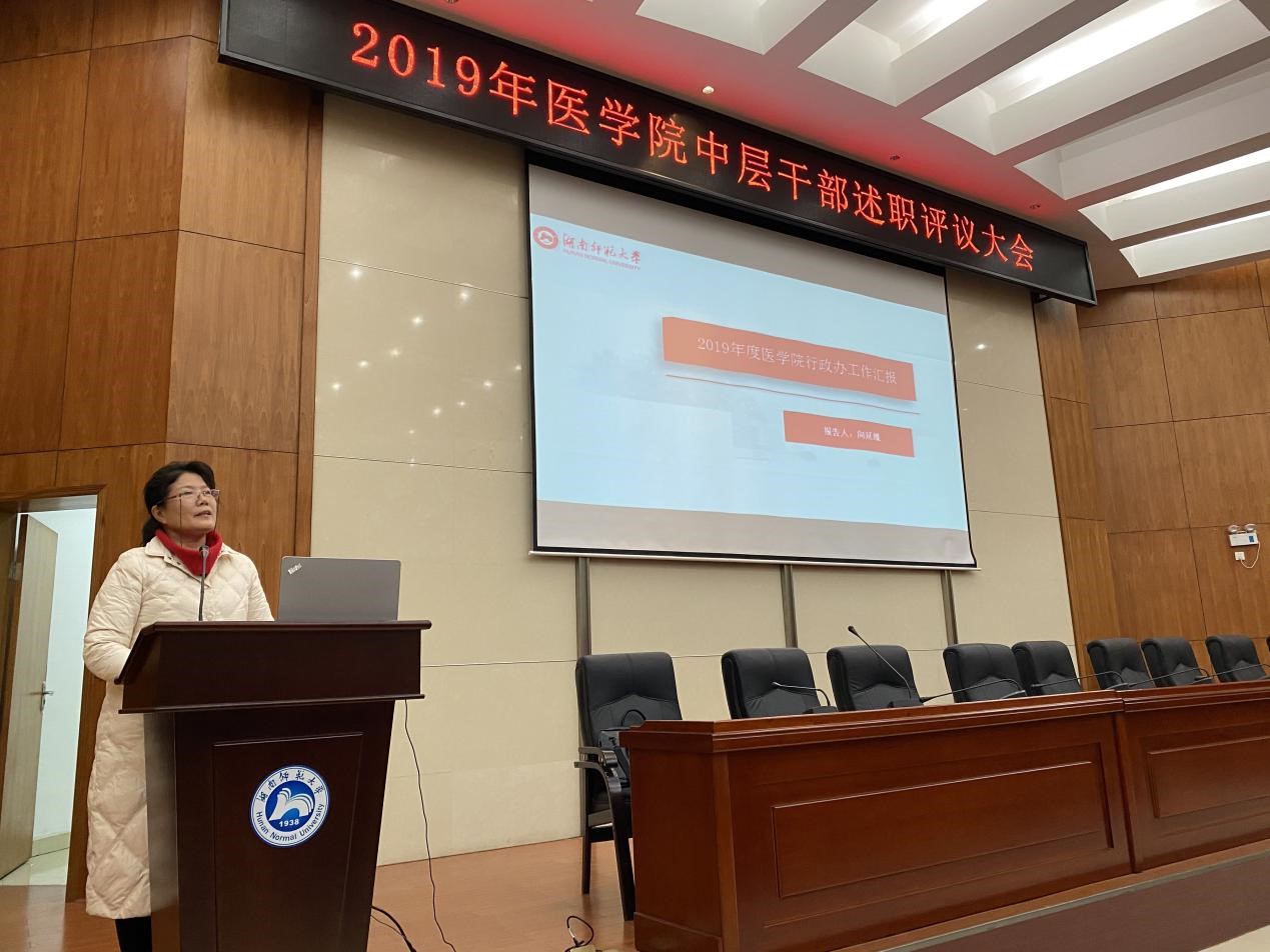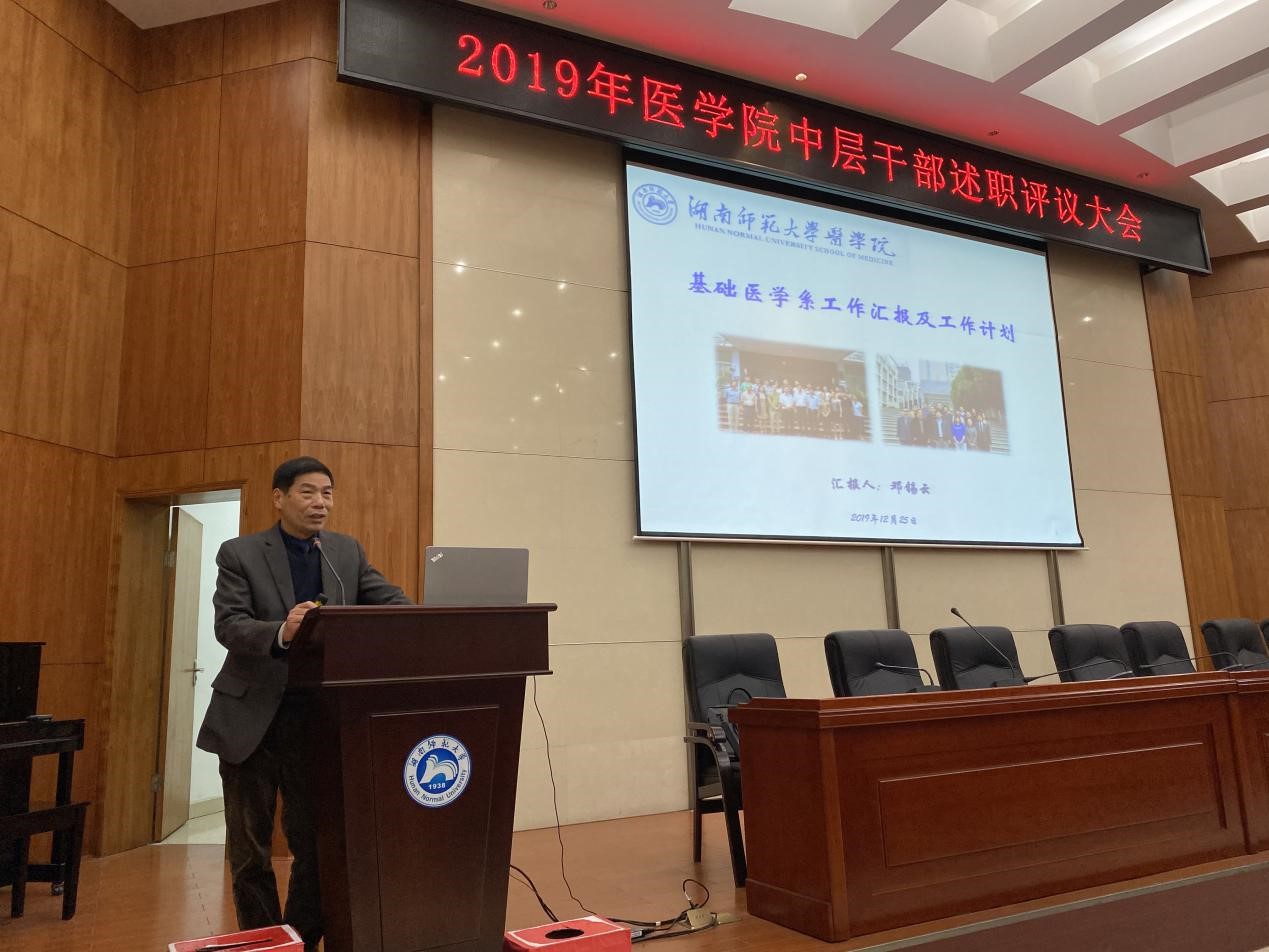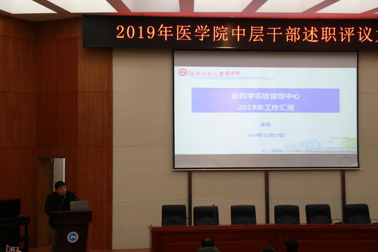 2019年12月25日,js555888金沙老品牌召开了全院中层干部2019年度述职评议大会。院党委书记鄢朝晖主持会议,院长何祖平、副院长张坚松、邓文艳、贺权源、党委副书记陈松出席大会,学院170余名教职员工参加述职评议大会。