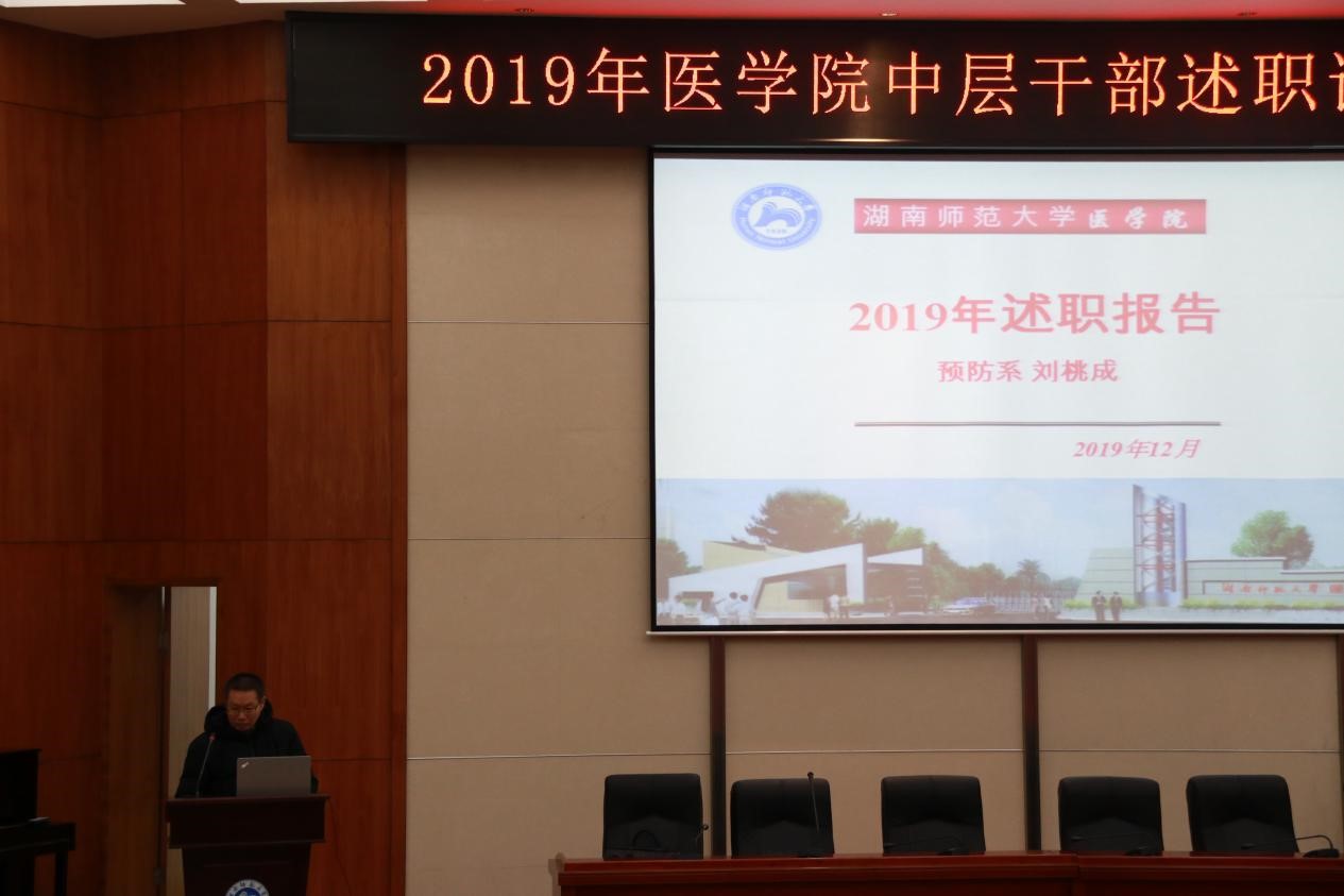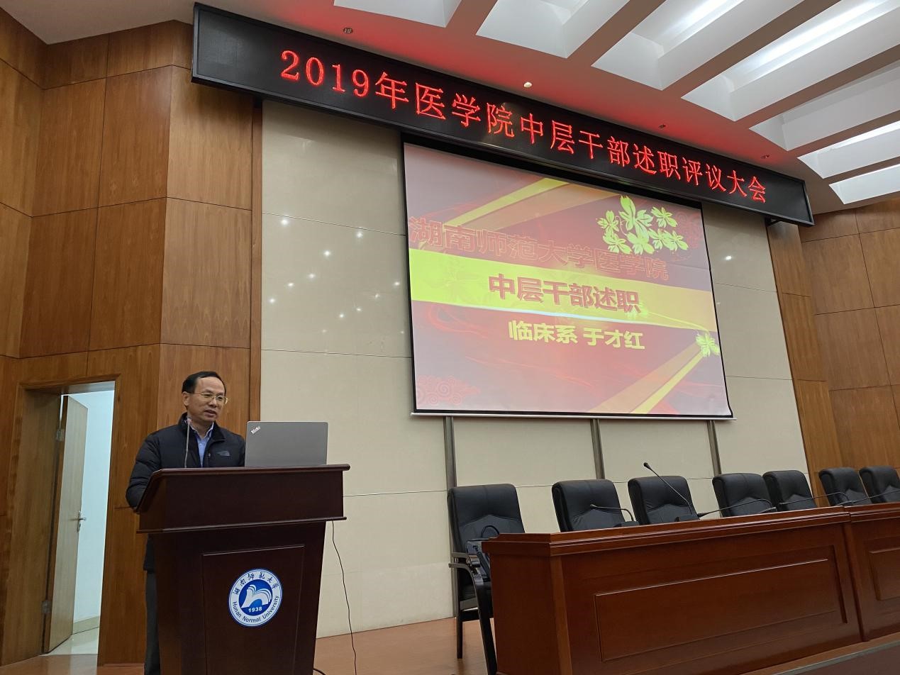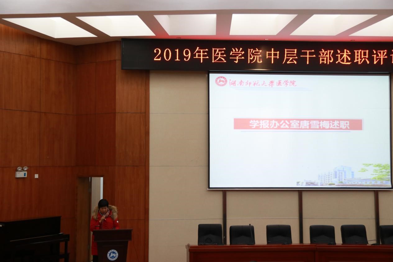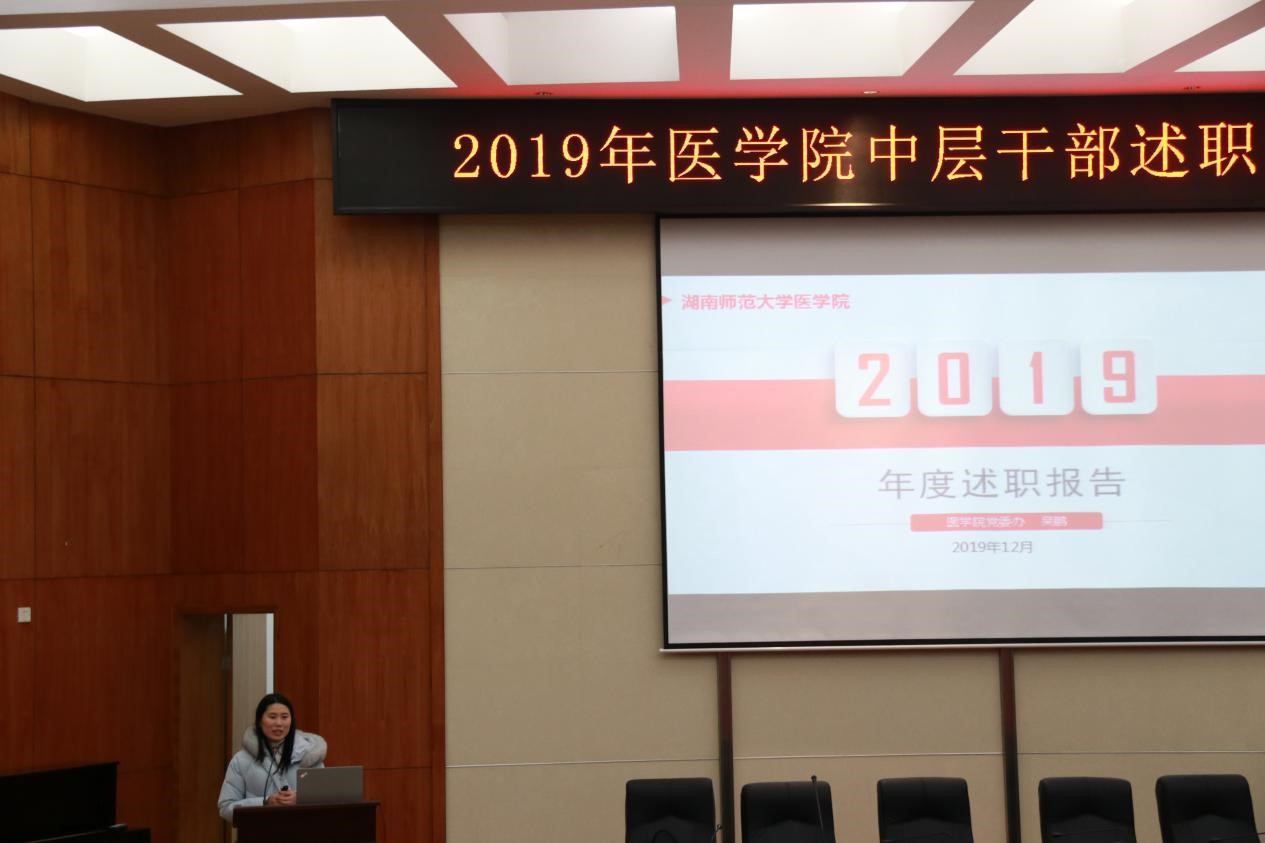 2019年12月25日,js555888金沙老品牌召开了全院中层干部2019年度述职评议大会。院党委书记鄢朝晖主持会议,院长何祖平、副院长张坚松、邓文艳、贺权源、党委副书记陈松出席大会,学院170余名教职员工参加述职评议大会。