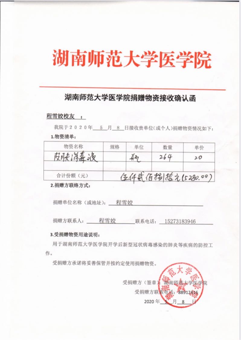 2003级药学系校友向延明、2008级护理系校友程雪姣等校友分别以个人名义,亲自前往学院,为金沙官网捐赠免洗手消毒液500余瓶,支持金沙官网抗击疫情。两位校友都是各自岗位上的佼佼者,有着强烈的社会责任与担当。他们表示,自己在校学习期间,一直得到学院及老师们的悉心教导和关爱资助。疫情当前,他们希望能为母校做一点自己的贡献,表达对老师和学弟学妹的关爱,与母校共克时艰,一起打赢这场疫情防控阻击战。