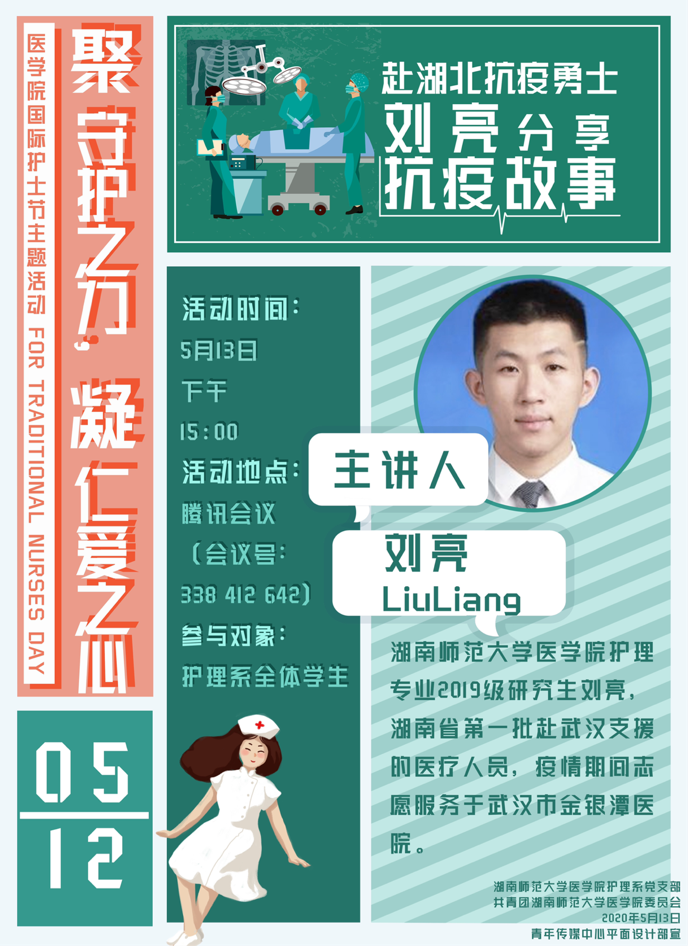 5月13日下午,金沙官网护理系党支部与院团委于腾讯会议举行国际护士节主题活动“聚守护之力,凝仁爱之心”,此次活动由金沙官网护理专业2019级研究生、湖南省第一批赴武汉支援的医护人员刘亮主讲,金沙官网护理系全体老师与学生参与此次会议。