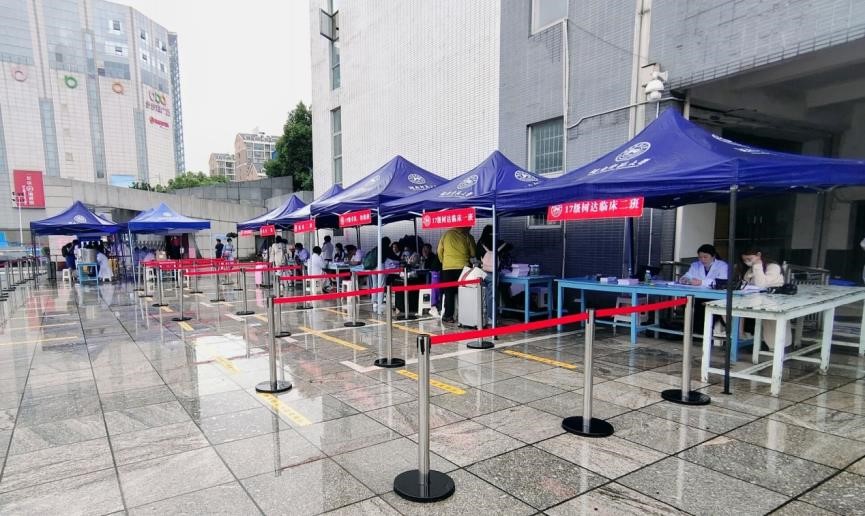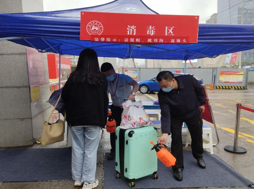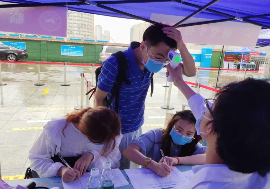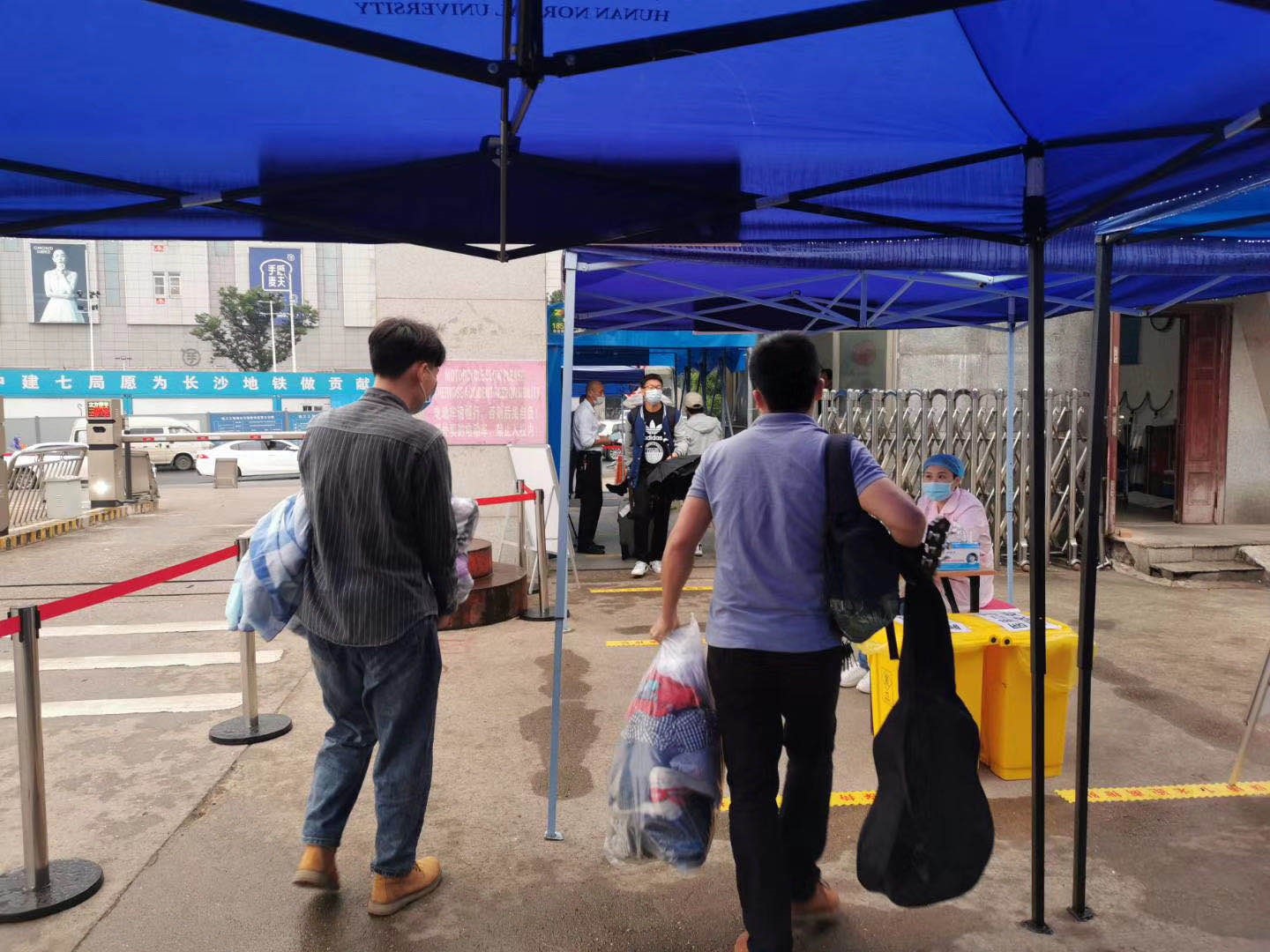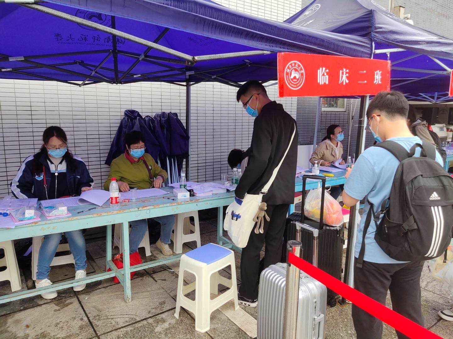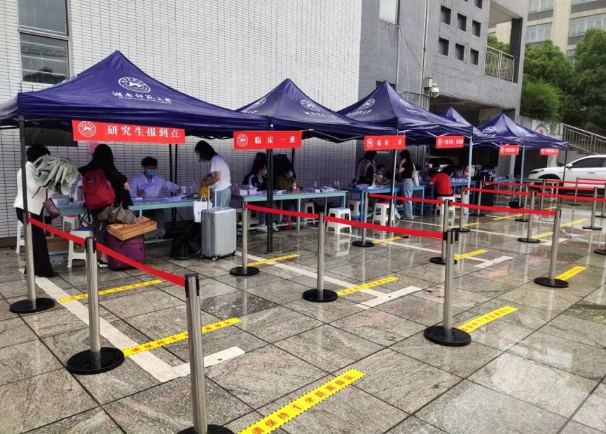 清晨7点,学院全体行政老师冒着倾盆大雨在报到处迎接学生们归来。同学们佩戴口罩,根据标识牌,在工作人员的引领下,按照间隔线,保持安全距离,经过复学报到专用通道,通过行李消杀、体温检测、流行病调查、查验健康码、上交健康卡、填写安全承诺书等手续完成入校登记等复学报到程序,进入校园。随着同学们的陆续到校,师生之间亲切问候,交流居家学习状态与健康状况,丝毫没有许久未见的疏离。老师们从早上七点到晚上十点冒雨坚守,为学生提供贴心报到服务。