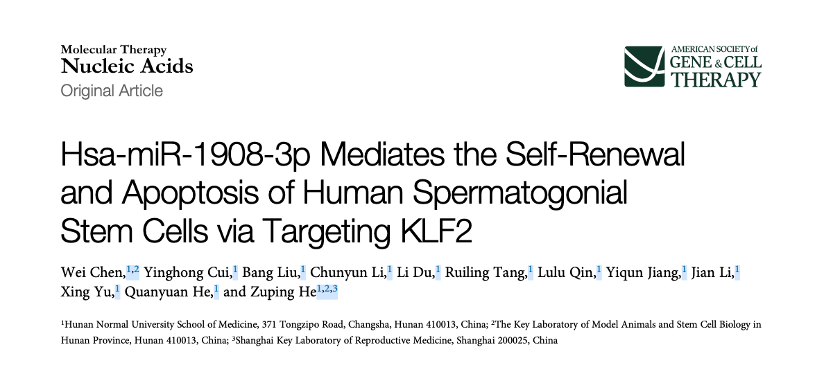近日,Cell子刊(Molecular Therapy-Nucleic Acids)发表了我校js555888金沙老品牌“模式动物与干细胞生物学”湖南省重点实验室何祖平教授研究组的研究论文Hsa-miR-1908-3p mediates the self-renewal and apoptosis of human spermatogonial stem cells via targeting KLF2。