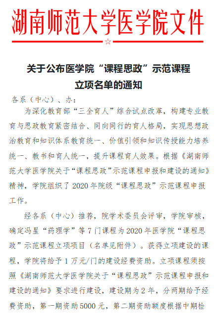 经各系(中心)推荐,院学术委员会评审,学院审核,确定冯星“药理学”等7门课程立项为2020年js555888金沙老品牌“课程思政”示范课程,要求项目负责人按照文件要求组织好课程团队,加强课程思政示范课程的建设、应用和推广,不断提高人才培养质量。金沙官网对获得立项建设的课程,给予1万元/门的建设经费资助,并明确对项目结题绩效评价优良者另给予后期资助和表彰。