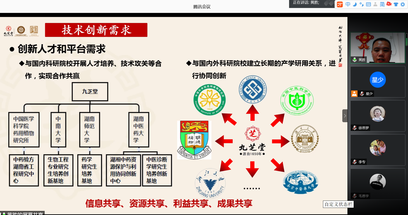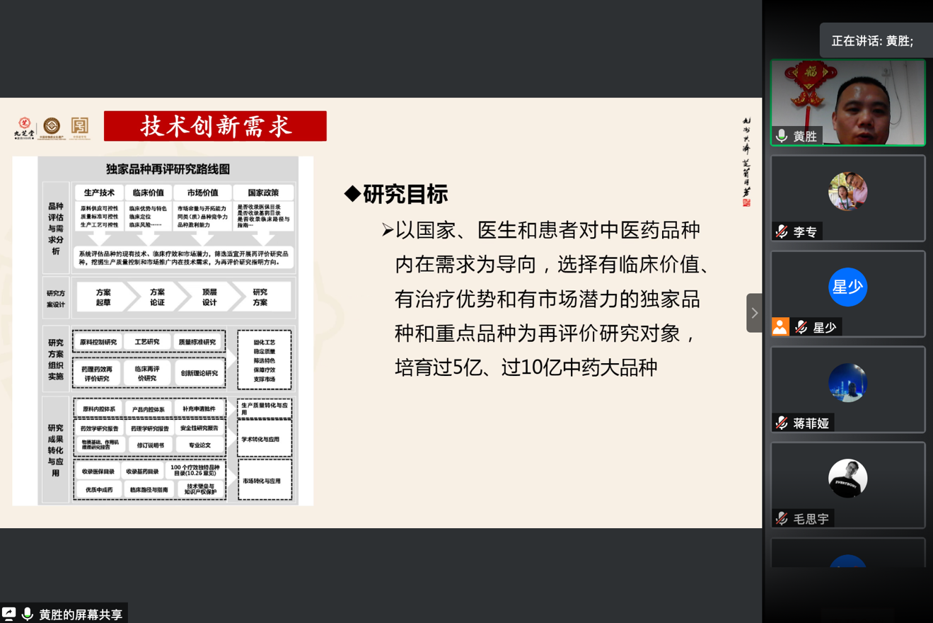 黄胜首先详细介绍了九芝堂的发展历史与发展现状,并着重介绍了九芝堂药业在中药创新上,特别是中药制剂技术与质量控制、现有品种的二次开发、新药创制所取得的成绩,同时提出在创新过程中面临的瓶颈与困难,特别是中药制剂基础研究薄弱,物质基础、作用机制研究进展缓慢;安全性、有效性控制仍需加强等。最后希望与科研院校建立产学研协同创新,实现人才培养、科学研究、中药创新等领域的合作共赢局面,并热情邀请金沙官网教师前往九芝堂股份有限公司参观指导工作。