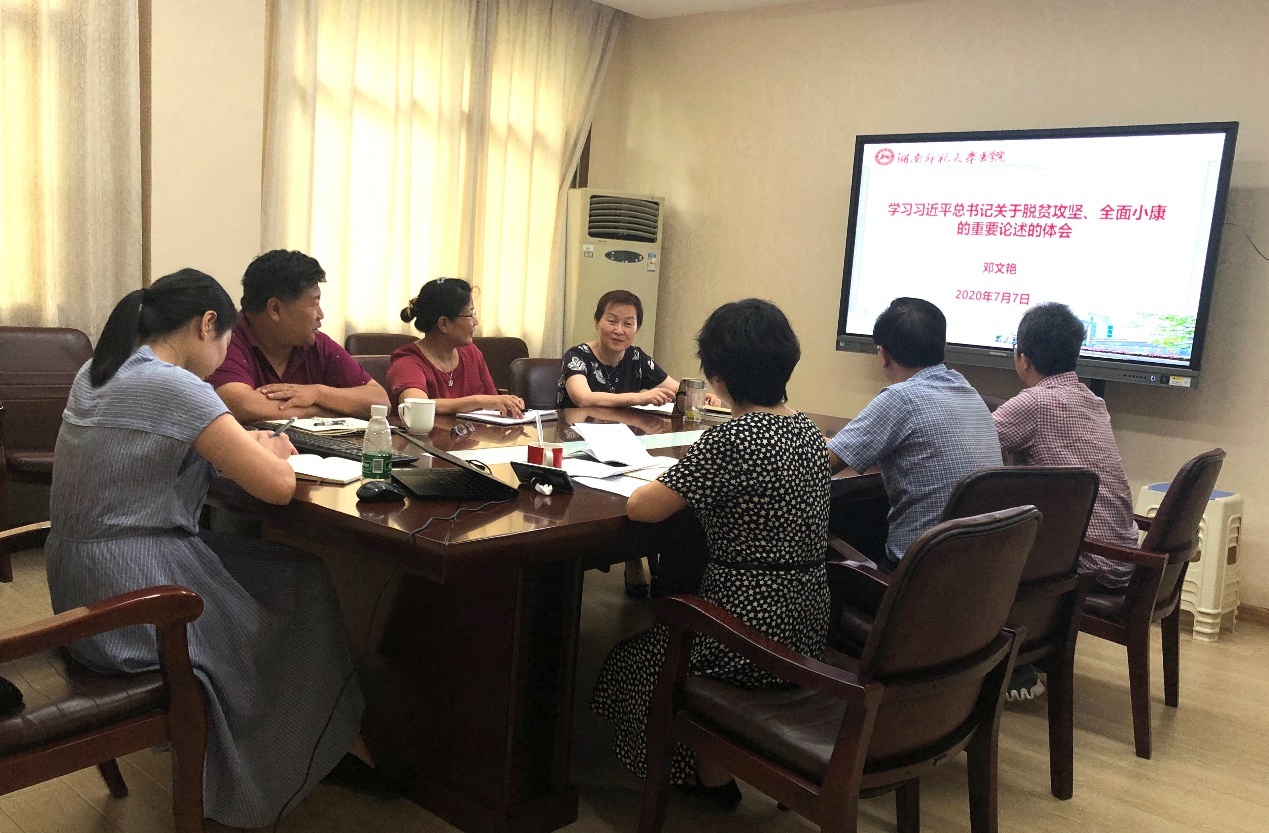 与会人员认真学习了《高等学校课程思政建设指导纲要》和习近平总书记关于脱贫攻坚、全面小康的重要论述,鄢朝晖结合金沙官网课程思政的开展情况作了《全面推进课程思政建设 努力提升人才培养质量》的主题发言,从课程思政的意义和目标、课程思政的工作思路和教学体系构建、如何实现课程思政三方面分享了学习体会。