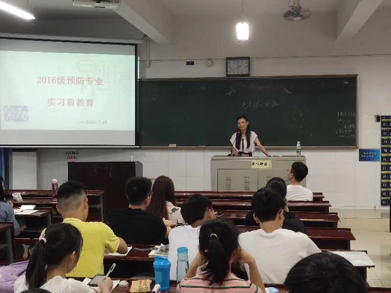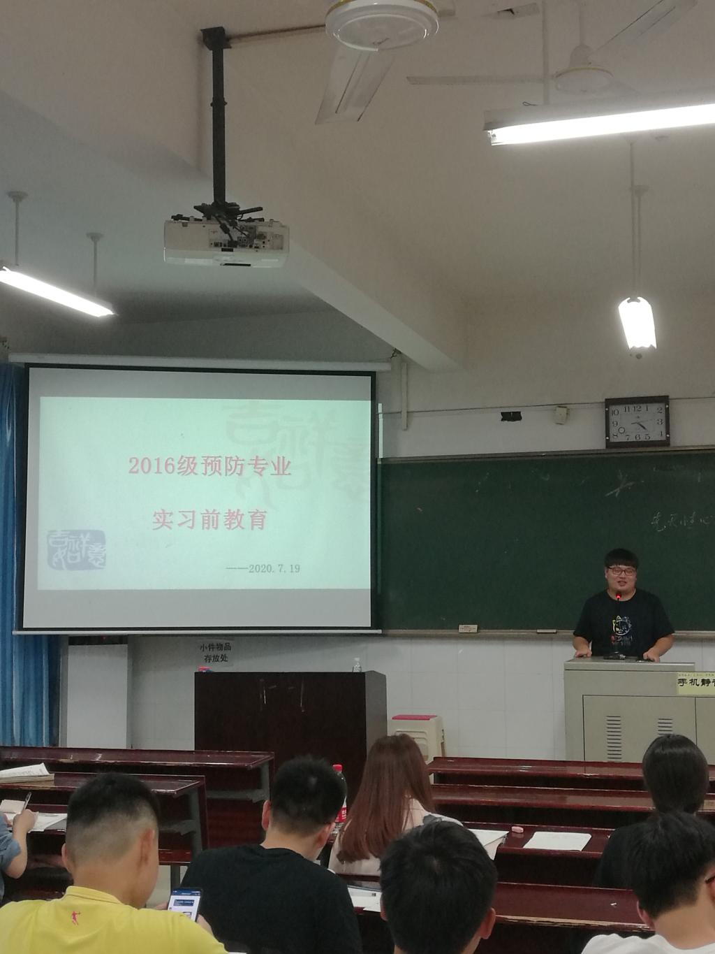 7月19日下午,2016级预防医学学生专业实习前教育会议在金沙官网召开,开福区疾控中心主任林玲、金沙官网实习办主任赵燕玲、预防医学系主任刘桃成、预防系支部书记陈适及2016级预防班全体学生参加会议,刘桃成主持会议。