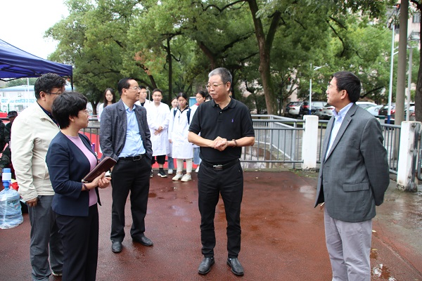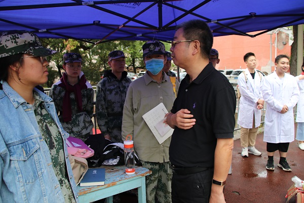 周俊武首先听取了军训总教官温嘉伟关于军训情况的汇报,随即对新生军训队列进行检阅。在视察过后,周俊武具体询问了军训新生里伤病员情况,并对伤病员表示慰问,他希望在确保学生安全的前提下,从严要求,高质量地完成训练任务。随后周俊武到达金沙官网爱心服务队军训医疗服务点,简单了解爱心服务队工作、职能、现有的药品以及服务队组成人员的情况,周俊武对金沙官网爱心服务队在服务新生军训方面以及在校级活动中发挥的作用表示充分肯定。