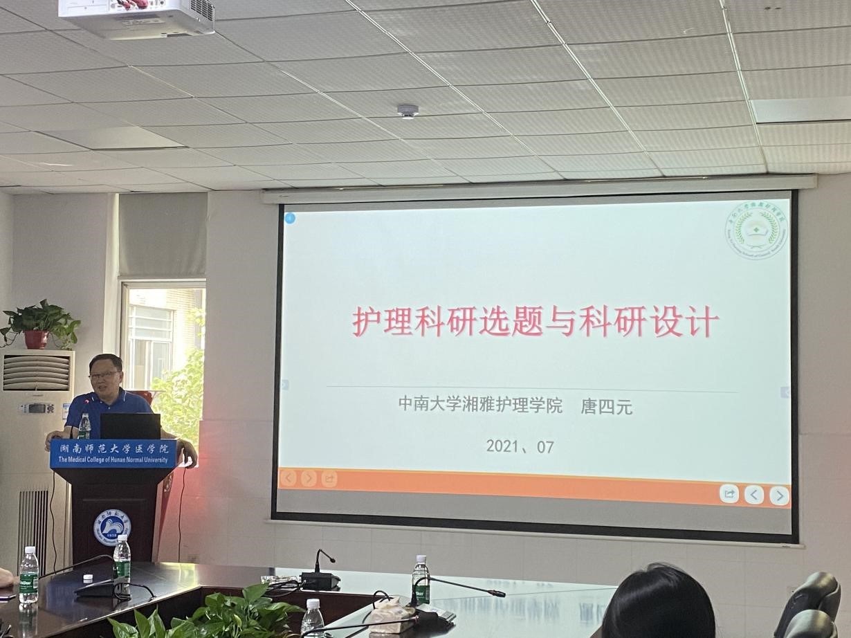 7月6日下午,中南大学湘雅护理学院院长、国务院特殊津贴专家、博士生导师唐四元教授莅临金沙官网做主题为《护理科研选题与科研设计》的学术讲座。金沙官网副院长张坚松主持讲座,护理系教师及研究生共同听了此次讲座。