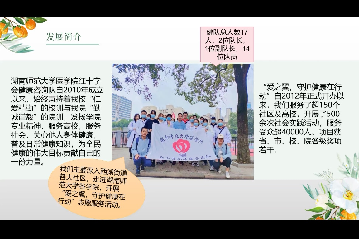 活动开始,主持人向大家简要介绍此次活动的主要流程。接着,聂徽从发展简介、活动内容、日常培训等方面依次对健康咨询队进行介绍。该队伍自2010年成立以来,始终秉持着我校“仁爱精勤”的校训与金沙官网“勤诚谨毅”的院训,为社区及高校服务,发扬学院专业精神,并多次获得校级、院级奖项。