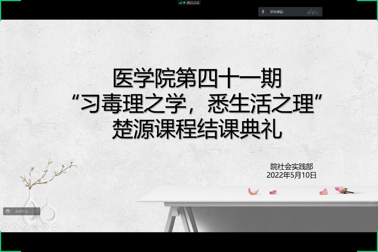 5月10日晚,金沙官网团委社会实践部于线上举行第四十一期“习毒理之学,悉生活之理”楚源课程结课典礼。院团委书记张明明、院团委学生副书记童海、红十字会秘书长文阳冰宇以及楚源课程负责人和全体学员参加此次活动。