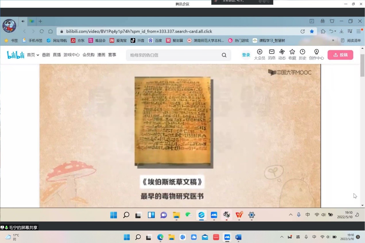 毛宁为学员共享屏幕,观看毒理学相关视频。该视频以“为何要学习毒理学课程”和“毒理学实质讲述了什么”为出发点,提出了“世间万物皆有毒,辨毒识毒须有度”的主题。
