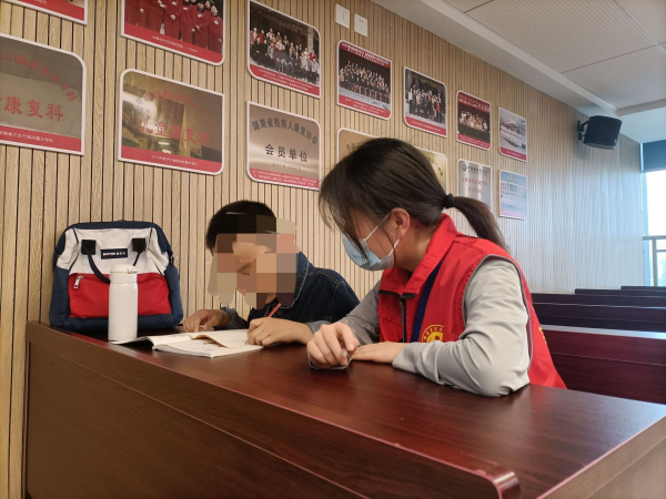 活动当天,志愿者早早的到达湖南省儿童医院康复科室八楼会议室,与医院活动负责人沟通好注意事项后,开始提供志愿服务。 初见志愿者,小朋友们因害羞而有些拘谨,于是志愿者积极主动陪他们聊天,辅导作业,屋内氛围逐渐升温。在志愿者的关爱陪伴下,孩子们慢慢打开心扉,不再拘束,会议室开始充满小朋友问问题的声音,气氛逐渐达到高潮,室内暖意浓浓。最后,在小朋友的欢声笑语中,结束了此次志愿活动。