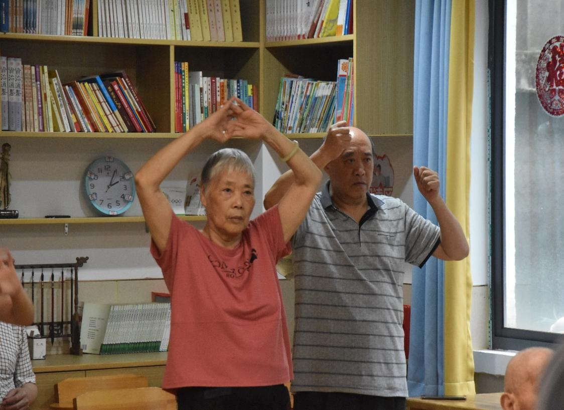此次活动分为三个环节:节目表演;陪同做操;聊天互动。同学们一共准备了四个节目——太极拳展示、《我的祖国》朗诵、交际舞表演以及全体成员合唱《我和我的祖国》。太极拳表演时,坐着的老人脸上露出了笑容,手也跟着表演的同学一起舞动。到了中间环节,实践团的同学们陪同医院老人跟着视频做健康操。接下来的聊天互动同学们分组与老人们进行一对一或多对一的交流。