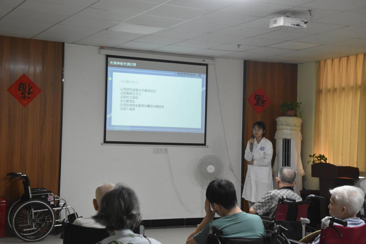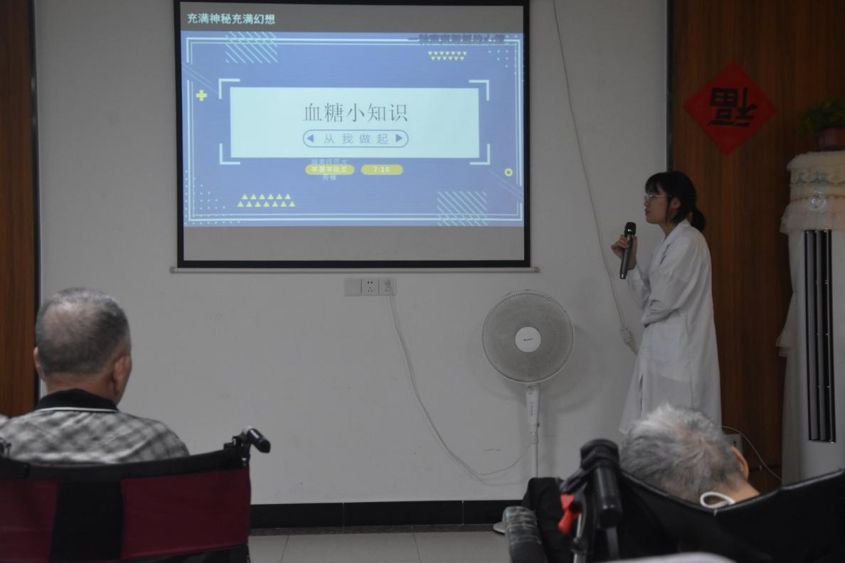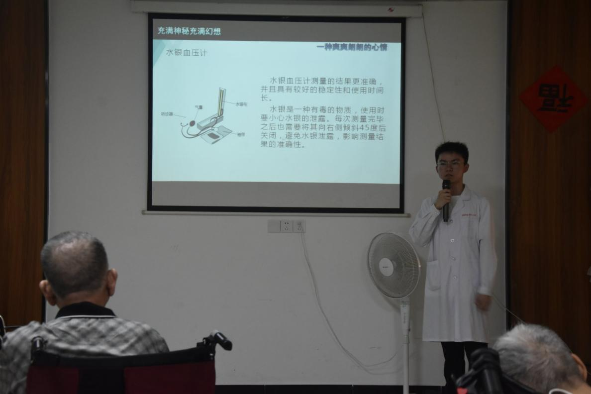 为进一步提高老人们对糖尿病和高血压的防治意识,帮助老人更好的了解自身的健康状况,队伍派出两名成员以幻灯片形式,简单明了地为在座的老人讲解了有关血糖、血压方面的知识。队员起初围绕什么是高血压、糖尿病以及引起的原因做出了讲解,其中也讲到测量血压的方法。接着讲解这两种疾病会带来的危害,糖尿病、高血压的预防和日常饮食的注意事项。结束前,结合湘仪养老中心的特点,讲解人着重介绍了日常饮食的注意事项。