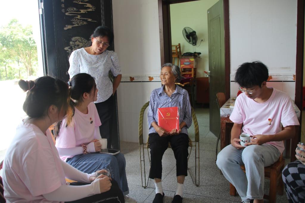 团队一行人乘车奔赴大塅村,走访慰问具有五十多年党龄的老党员孔凡菊。“天使在人间”队长黎姿详细询问了她的身体状态和生活状况,与她话家常、忆往昔。在探访期间,孔凡菊提到了自己的入党初心。她表示,自己出生的年代重男轻女的社会现象极为严重,当时家中小孩众多难以存活,女生大多被抛弃送走,但她靠着顽强的意志挺过了那段艰难的岁月。她当即决定要为女性发声,让女性同胞从此站起来。因此,她决定加入中国共产党,深入基层,听取广大妇女同胞的声音,向大家证明女性也可以为了共产主义奋斗终身。她已经在村中担任妇女主任三十多年,其间带领村中女性努力拼搏,争取成为生产队队长。她也向大家分享了担任共产党员时为人民做出的贡献,比如在村民小孩溺水时第一时间冲下水中救助等等。最后,她向青年一代提出倡议,青年人是中国共产党的孩子,需要尊敬老人、帮助孤寡残疾、支持并帮助有困难的人群,为人民干实事谋幸福。访谈结束,团队成员为孔凡菊进行了血糖、血压测量以及推拿服务,突出体现金沙官网专业特色。