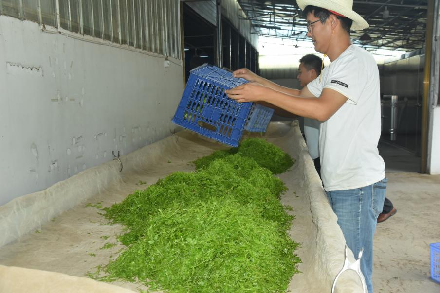 调研团成员们来到了垕王村莓茶加工厂拜访基地负责人。他向我们介绍了莓茶加工的一系列过程:晾晒,杀青,揉捻,松包,烘干等。负责人还向我们介绍了莓茶的不同种类,为我们泡了“春茶”“短茶”“夏茶”等几种莓茶以品尝。接着,负责人讲述了他从2019年回乡创业建厂、振兴乡村的经历。团队成员们了解到垕王村的年轻力量大多外出务工,留在村里的多为老年人。负责人表示他聘请老人家采摘茶叶进行挑选,以帮助垕王村留守村民们补贴家用。厂长希望能够借莓茶的生产加工带动垕王村的共同富裕;员工们对厂长的做法也表示认可和赞同,并表示利用青年的力量加大宣传莓茶,能够助推垕王村更多青年力量返乡务农带动乡村产业振兴发展。