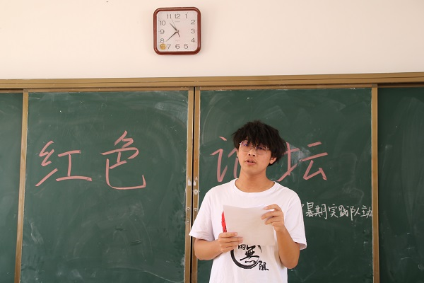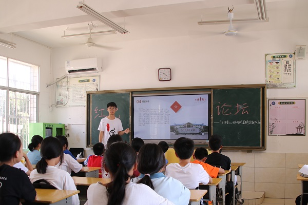 7月23日上午,金沙官网“乡伴童心,乡伴成长”暑期赴平江队伍于三墩中学举办红色论坛。此次红色论坛以平江起义为背景,队长文梦瑶担主持人,我队全体成员及全部学生参与。